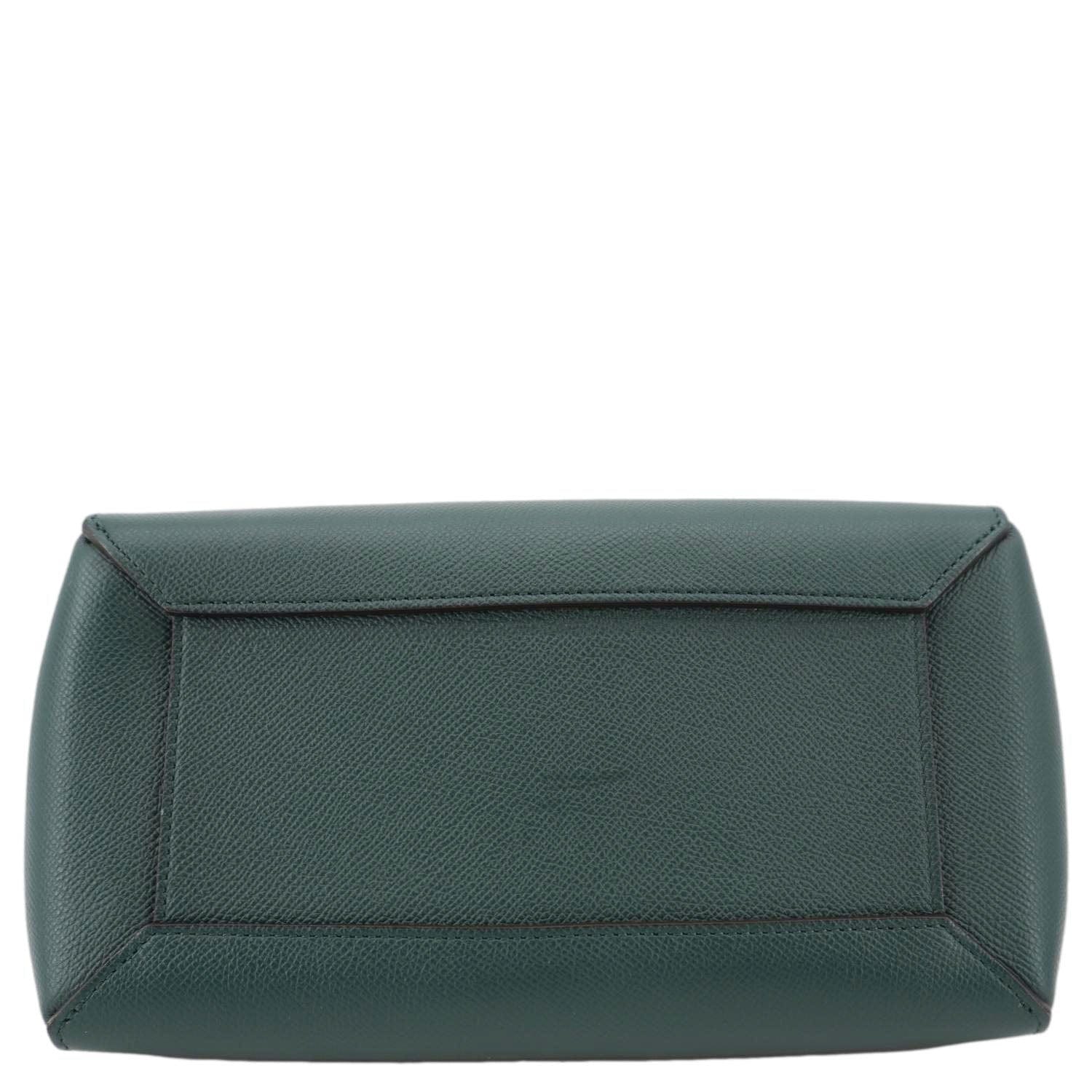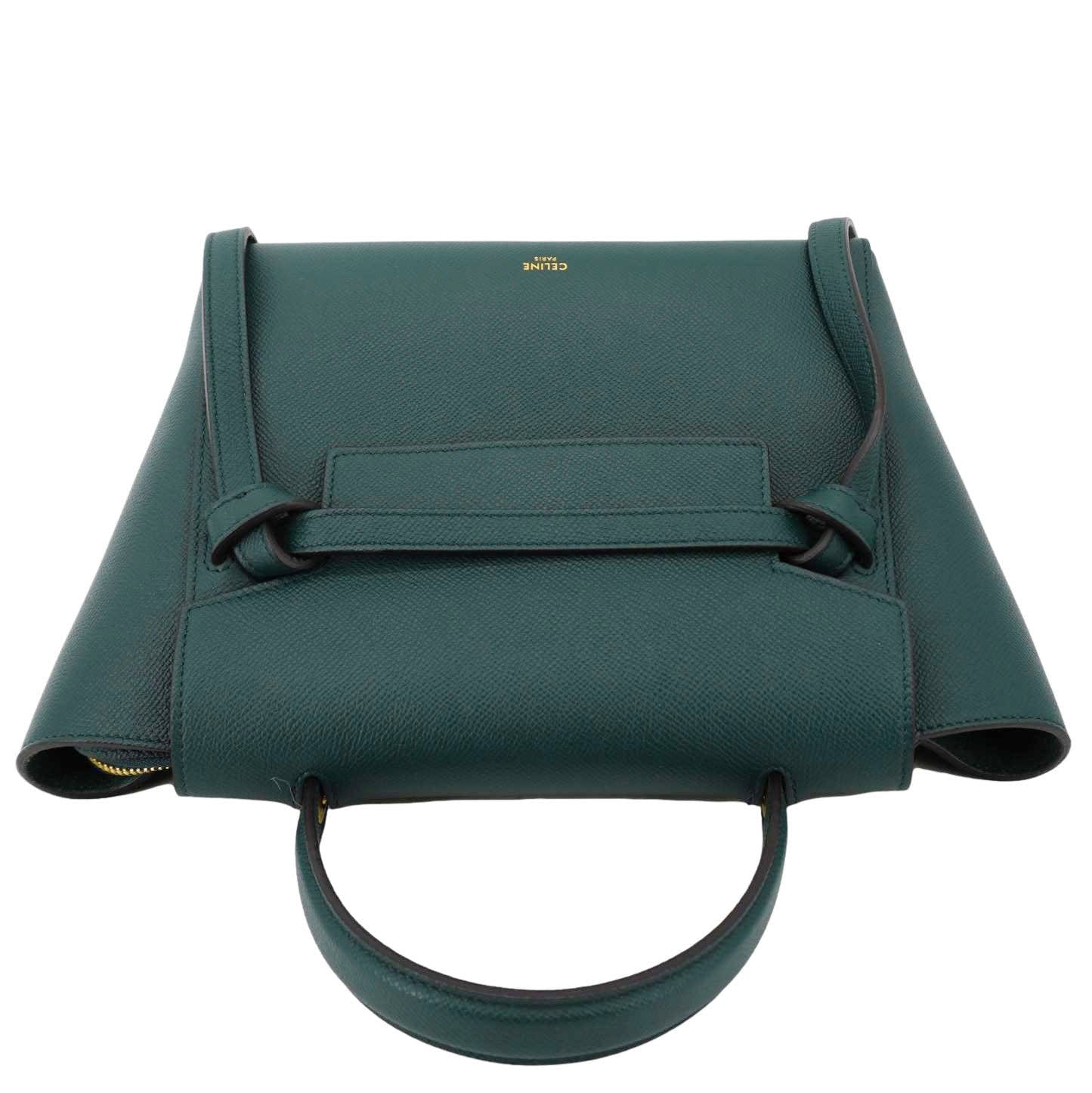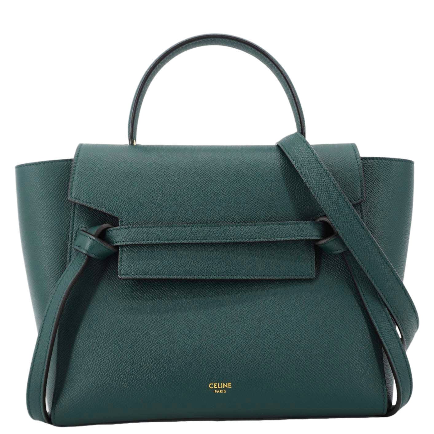 Celine Micro Belt Grained Leather Shoulder Bag in green. This elegant and structured bag features soft grained leather, a distinctive knotted belt detail, and both top handle and shoulder strap for versatile wear.