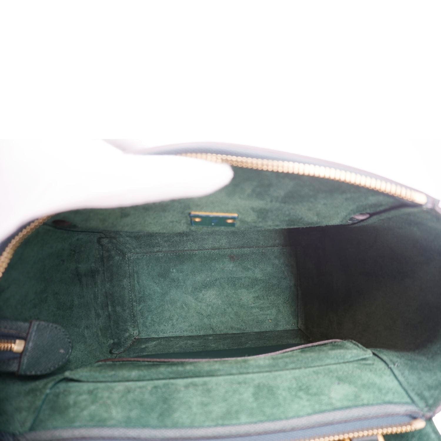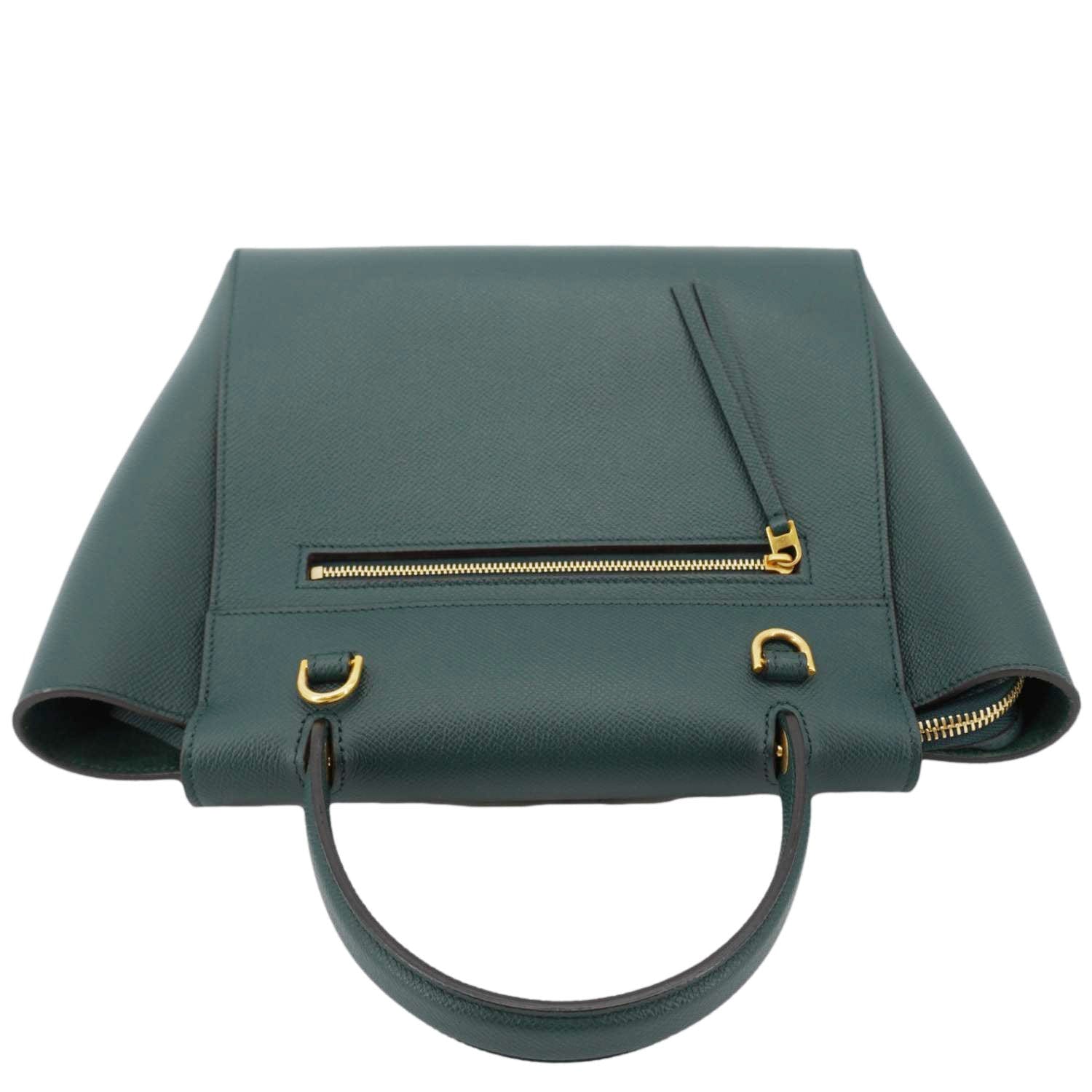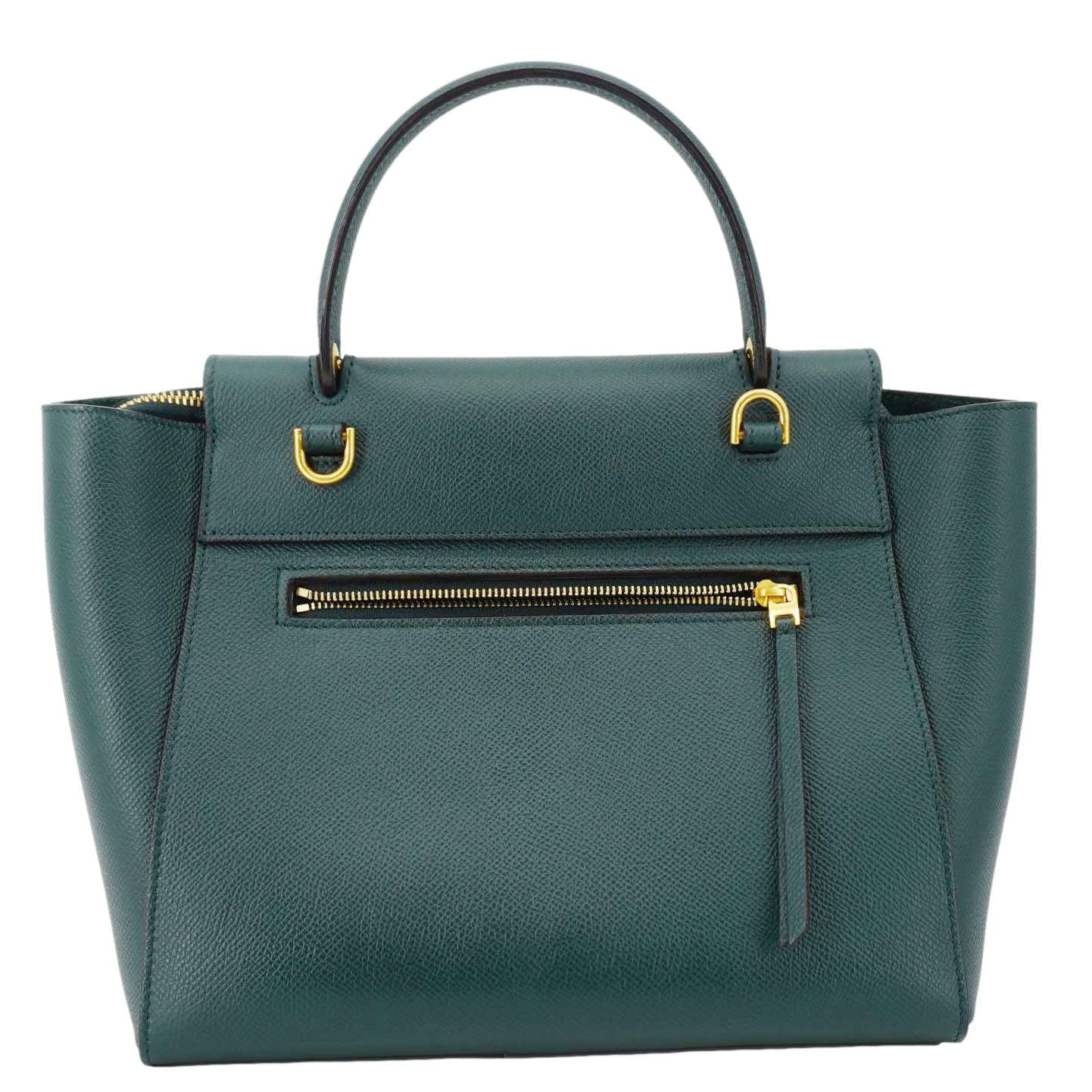 Celine Micro Belt Grained Leather Shoulder Bag in green. This elegant and structured bag features soft grained leather, a distinctive knotted belt detail, and both top handle and shoulder strap for versatile wear.