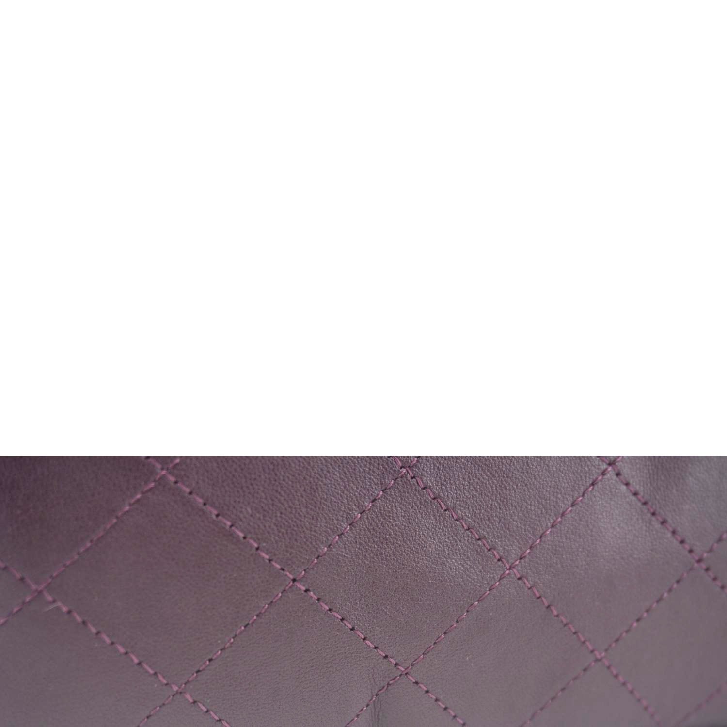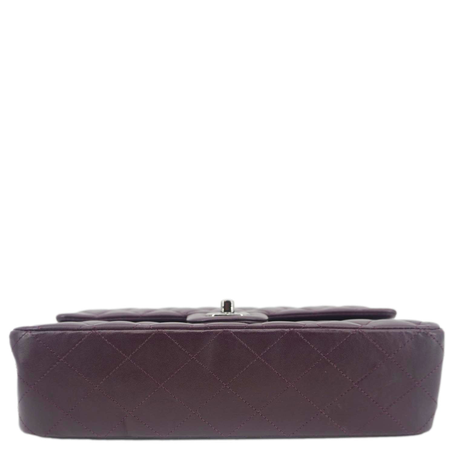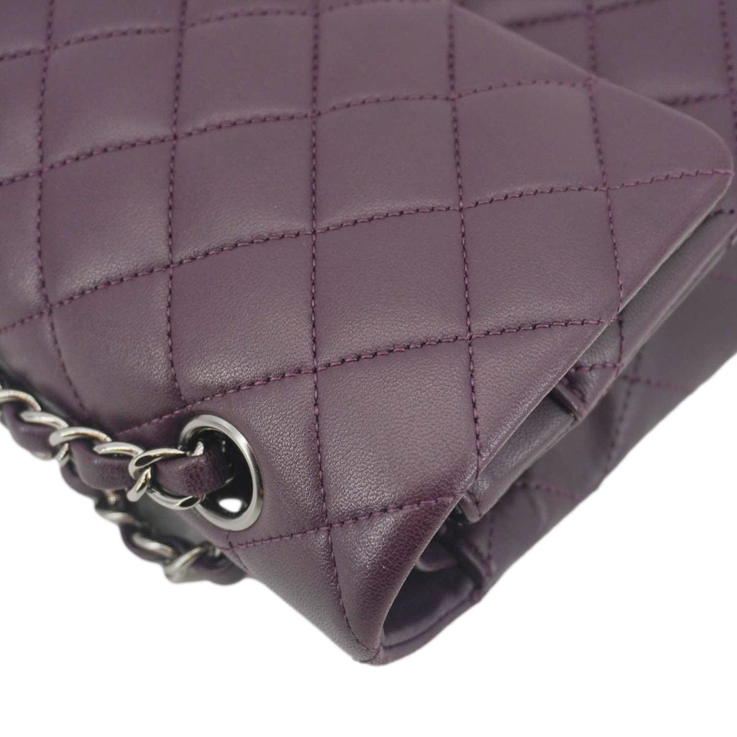 The Chanel Classic Flap Medium Shoulder Bag in quilted purple leather features the iconic CC turn-lock and elegant chain strap. Timeless and sophisticated, it adds a bold pop of color to any ensemble.