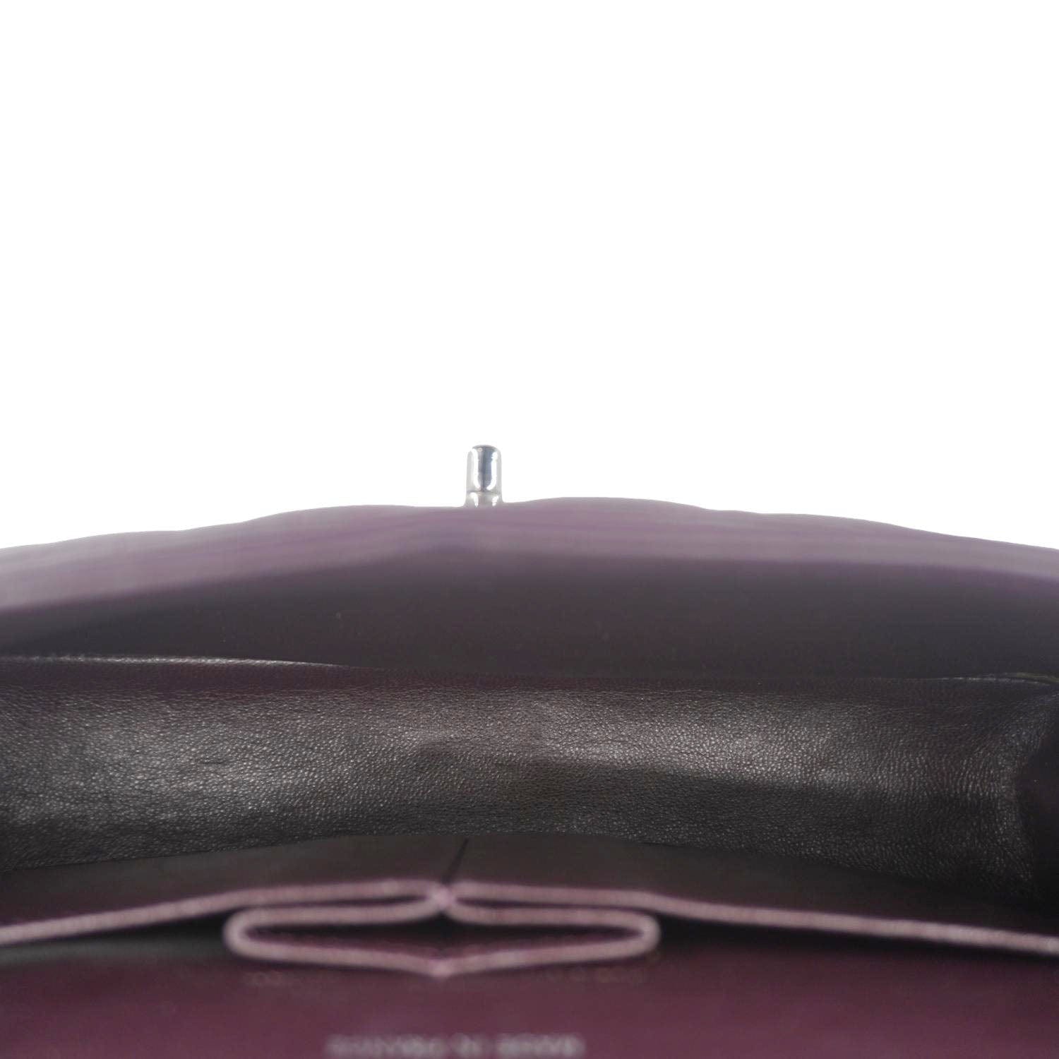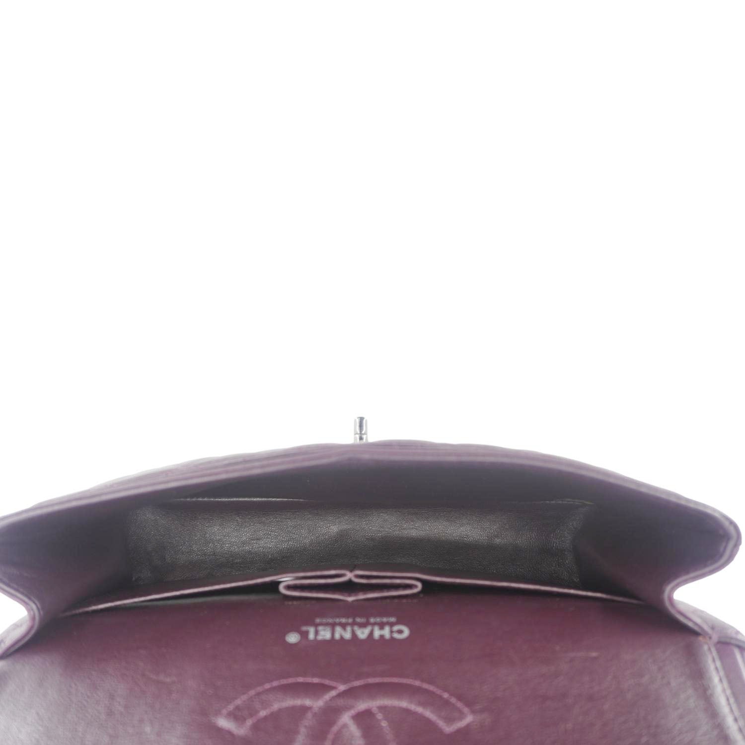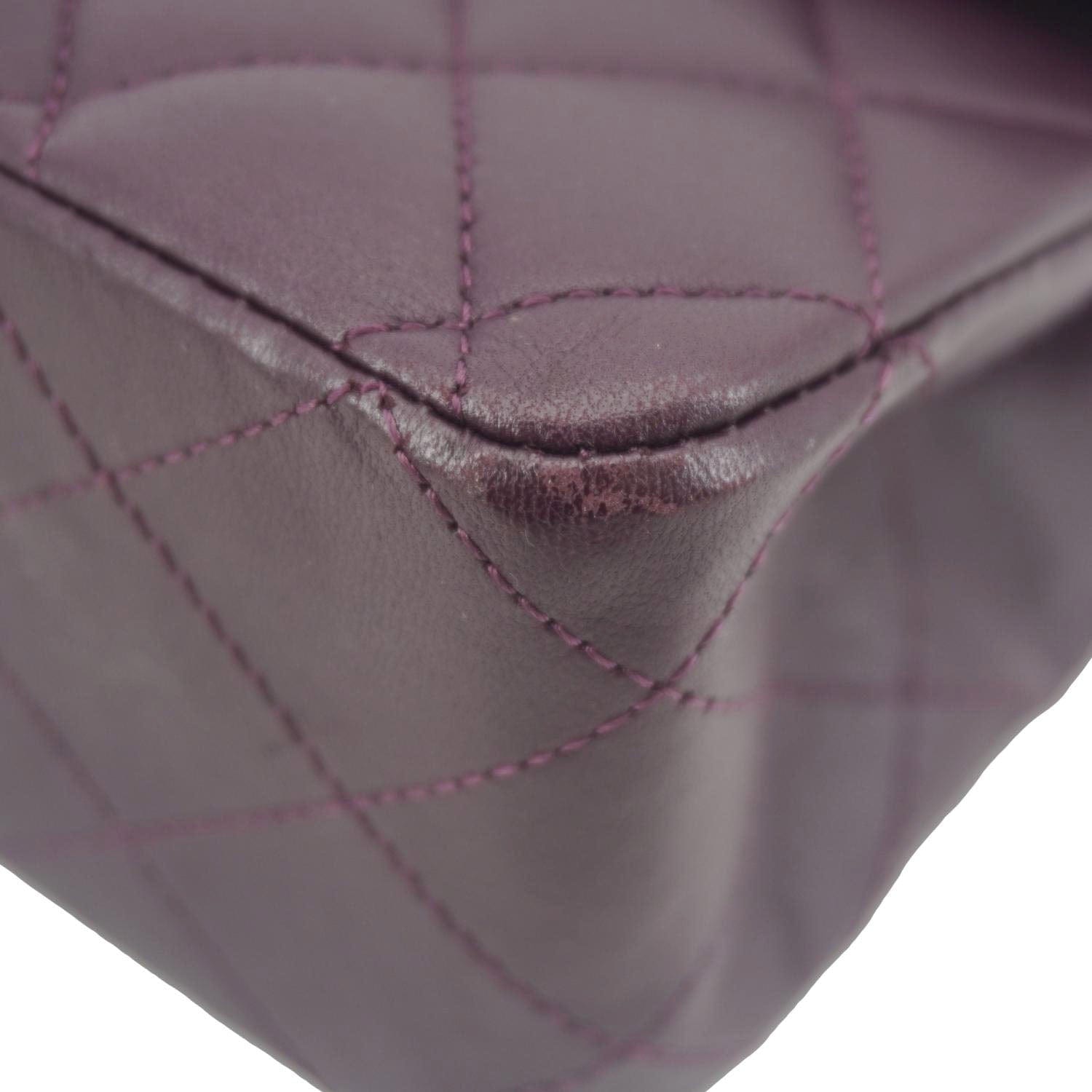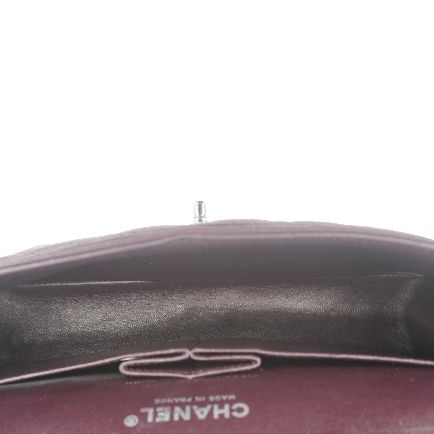 The Chanel Classic Flap Medium Shoulder Bag in quilted purple leather features the iconic CC turn-lock and elegant chain strap. Timeless and sophisticated, it adds a bold pop of color to any ensemble.