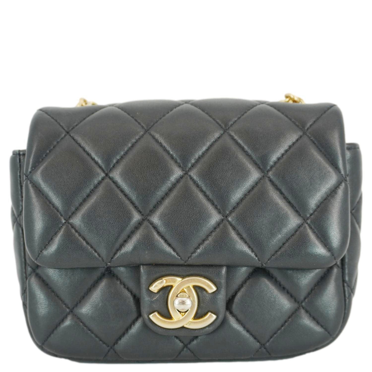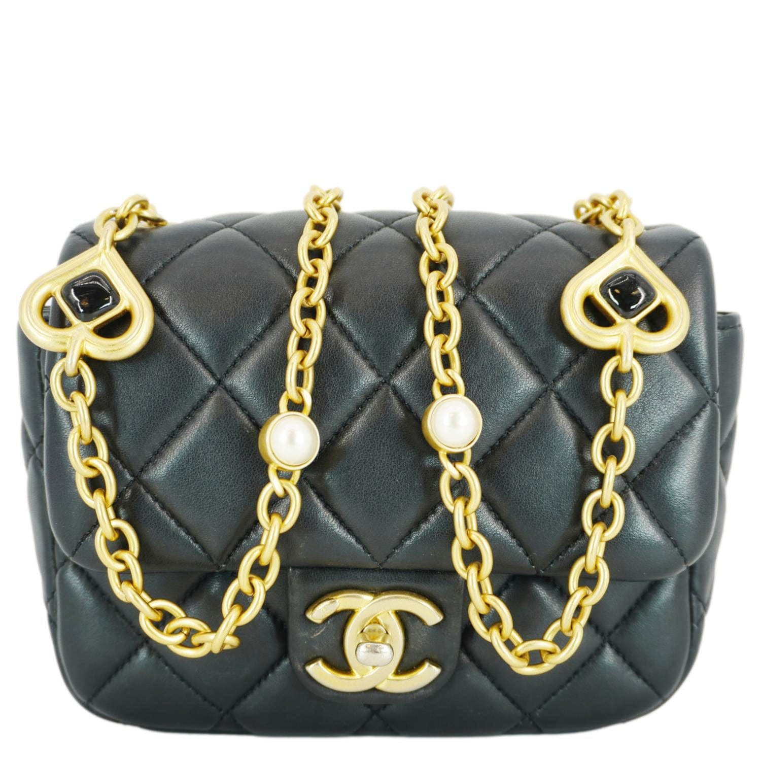 The Chanel Enamel Pearl Charm Me Square Flap Mini Crossbody Bag in black quilted lambskin exudes timeless elegance. Adorned with delicate pearl charms and enamel accents, it features a compact design with a signature CC turn-lock closure.