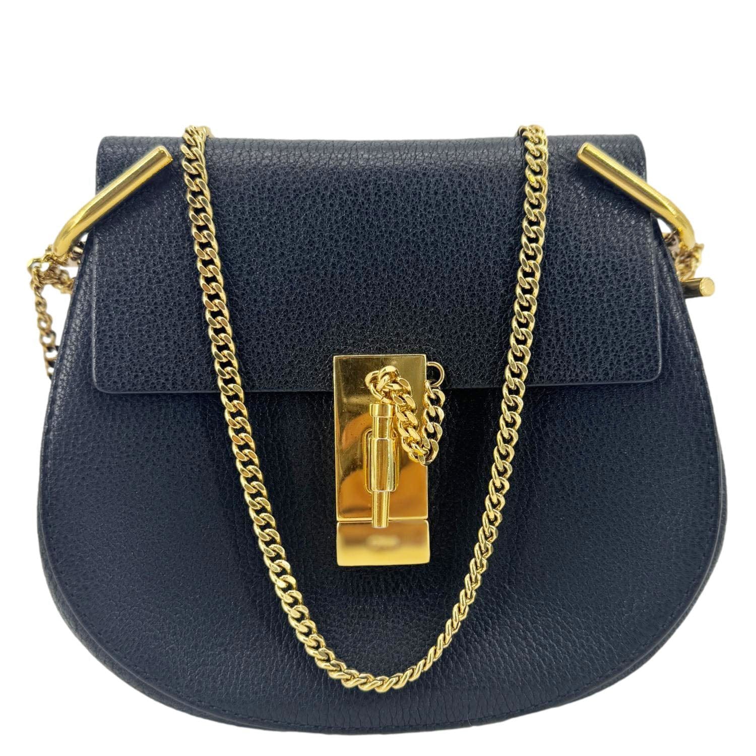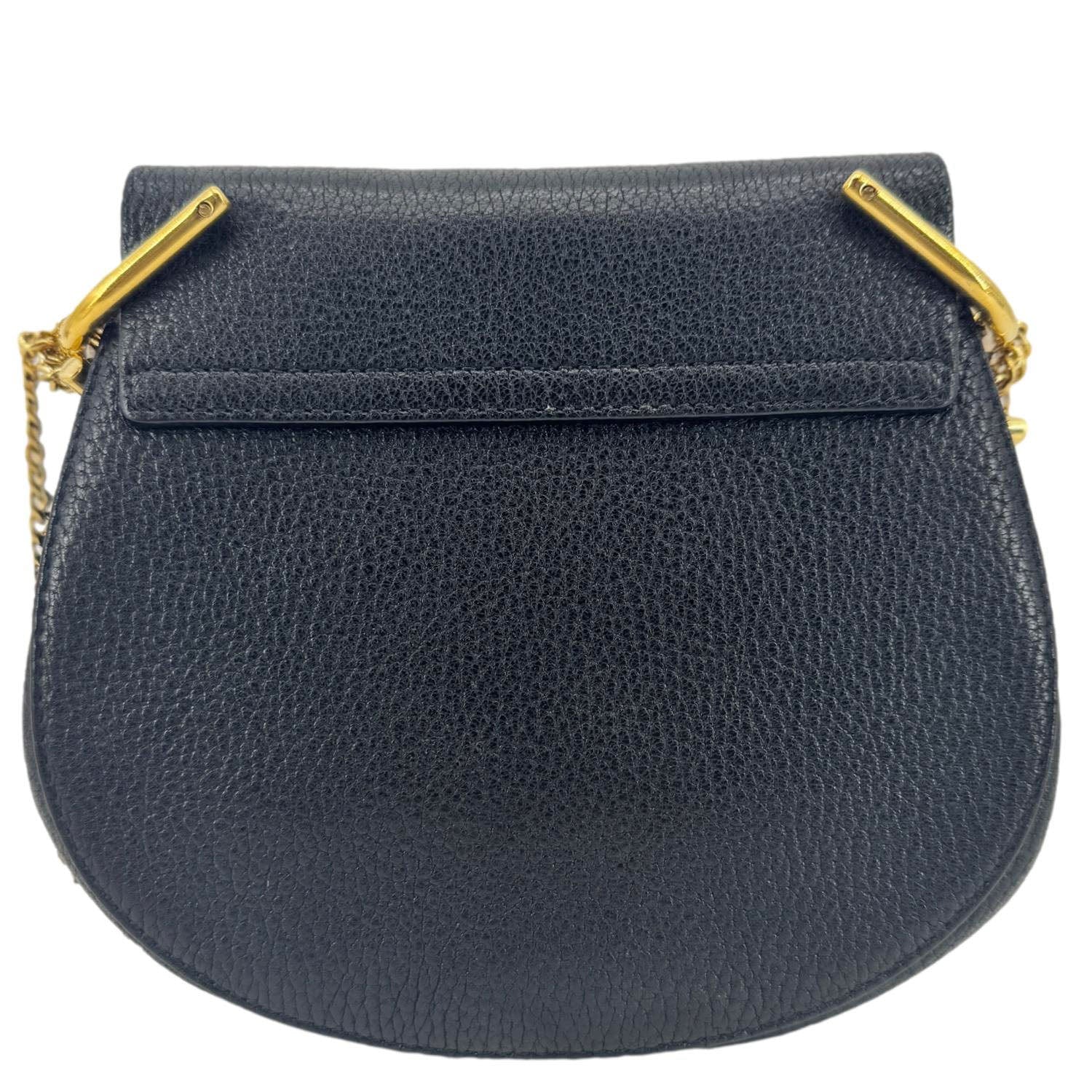 The Chloé Drew Mini Crossbody is crafted from black grained leather with a chic curved silhouette and gold-tone hardware. Its compact size and elegant chain strap make it perfect for day-to-night styling.