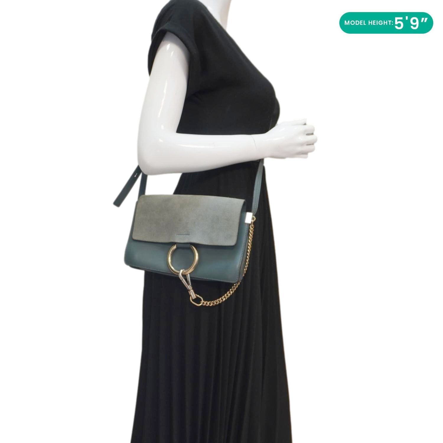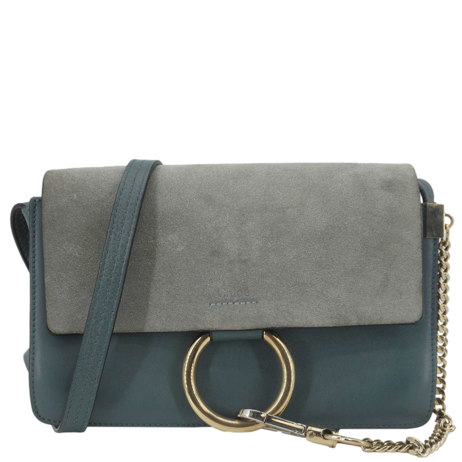 The CHLOÉ Faye Small Shoulder Bag in gray suede and leather features a distinctive ring and chain detail with a sleek, structured silhouette. Elegant and modern, it’s a signature piece for everyday chic.