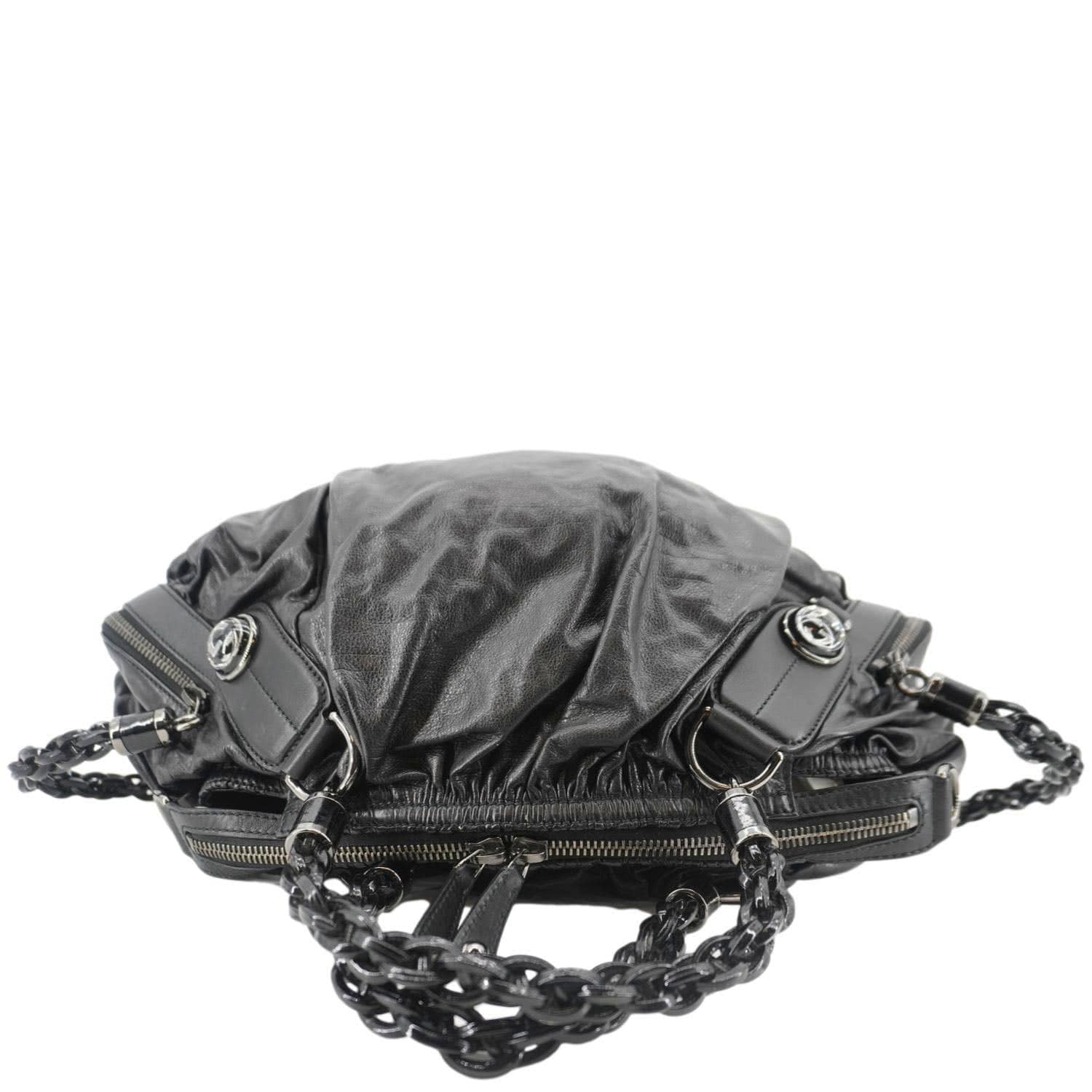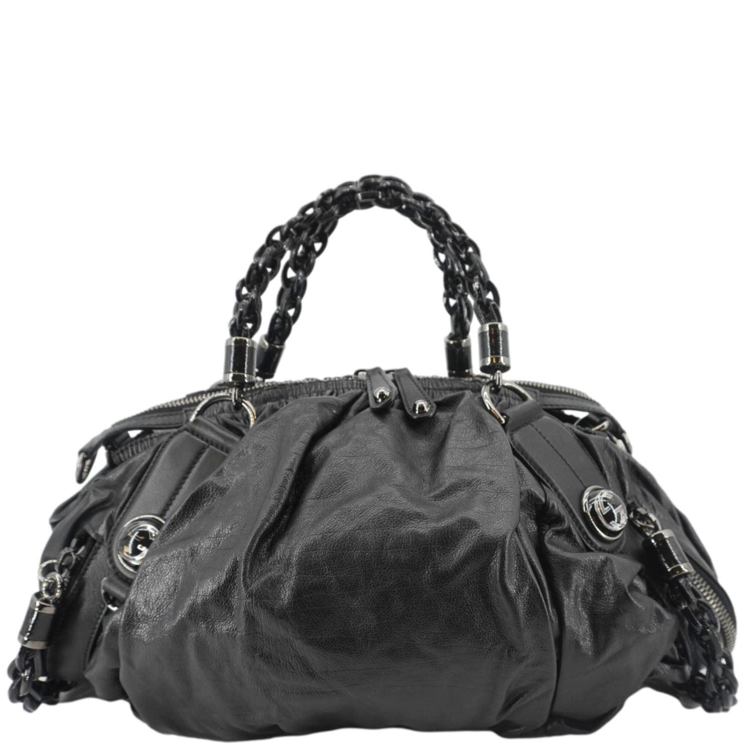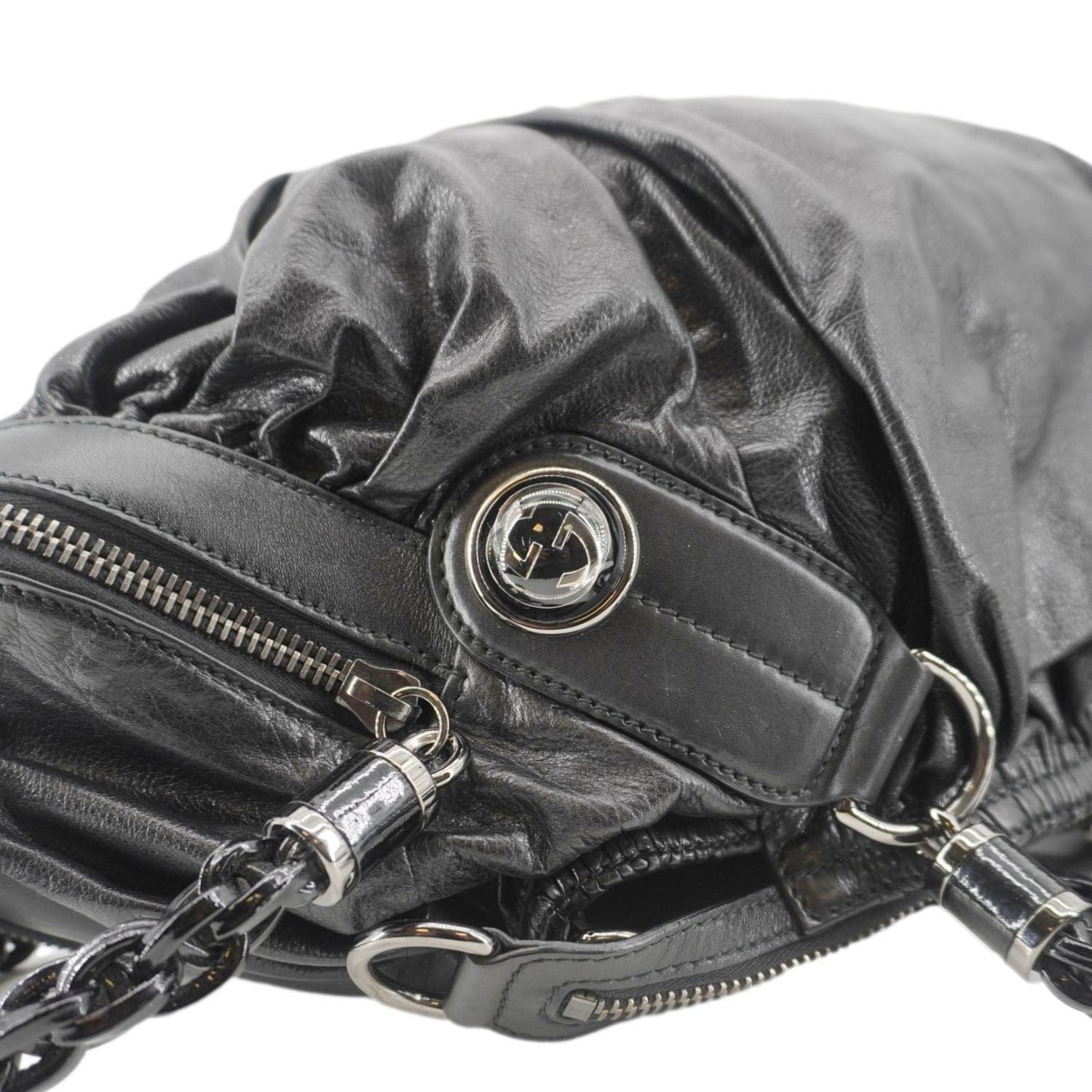 The GUCCI Galaxy Medium is a chic black leather shoulder bag with a top handle, featuring a modern, structured design and the brand's iconic interlocking G detail. Perfect for both day and night, it exudes timeless sophistication.