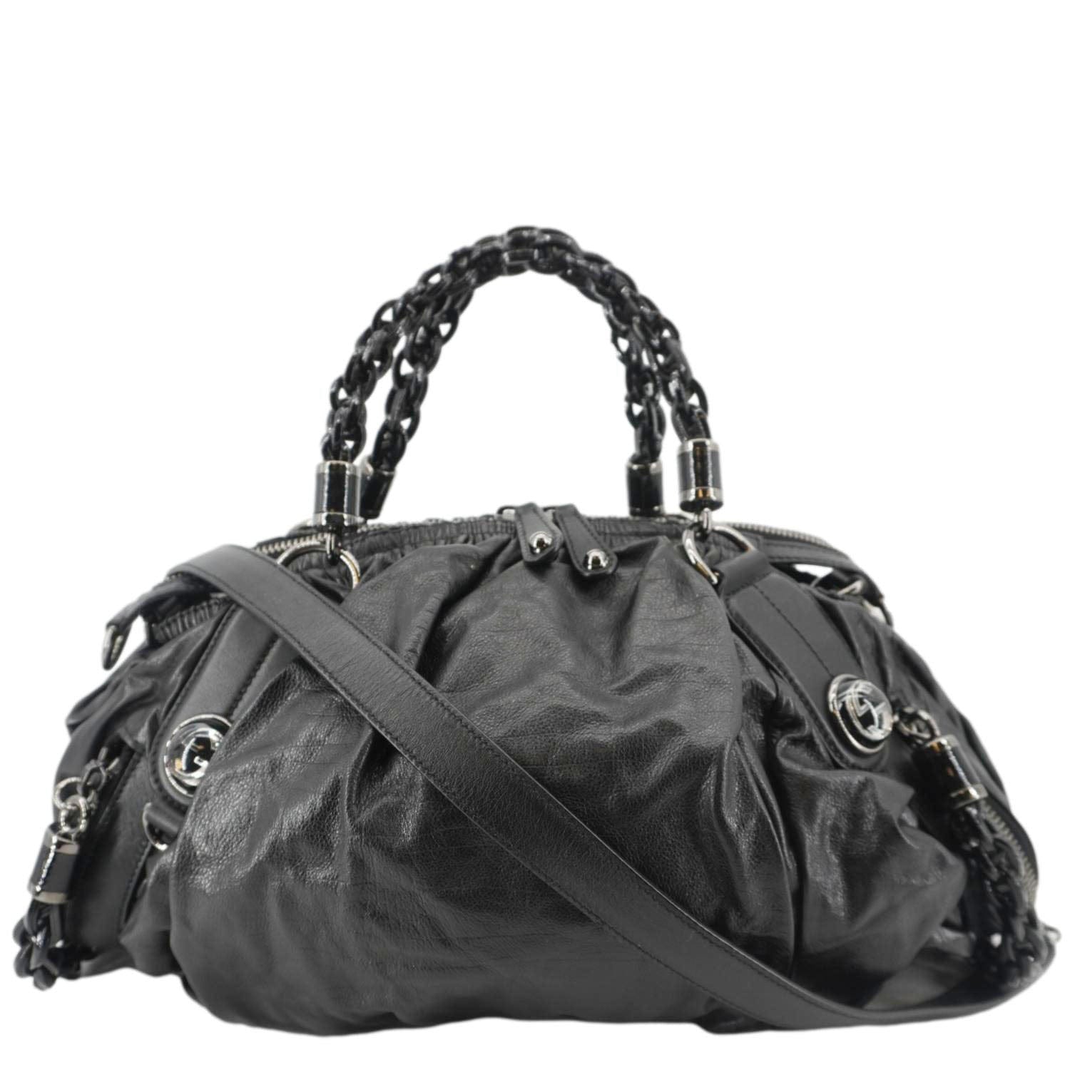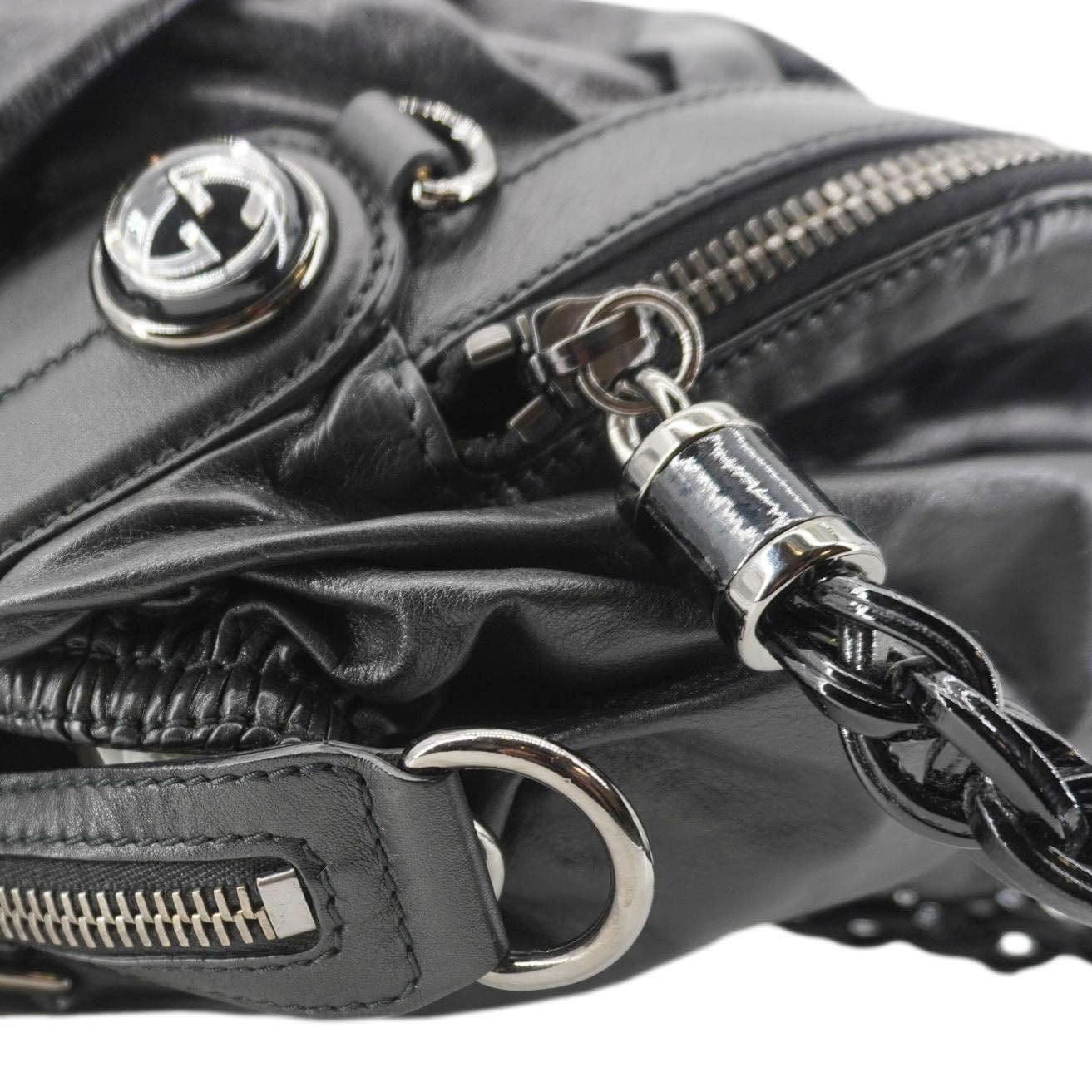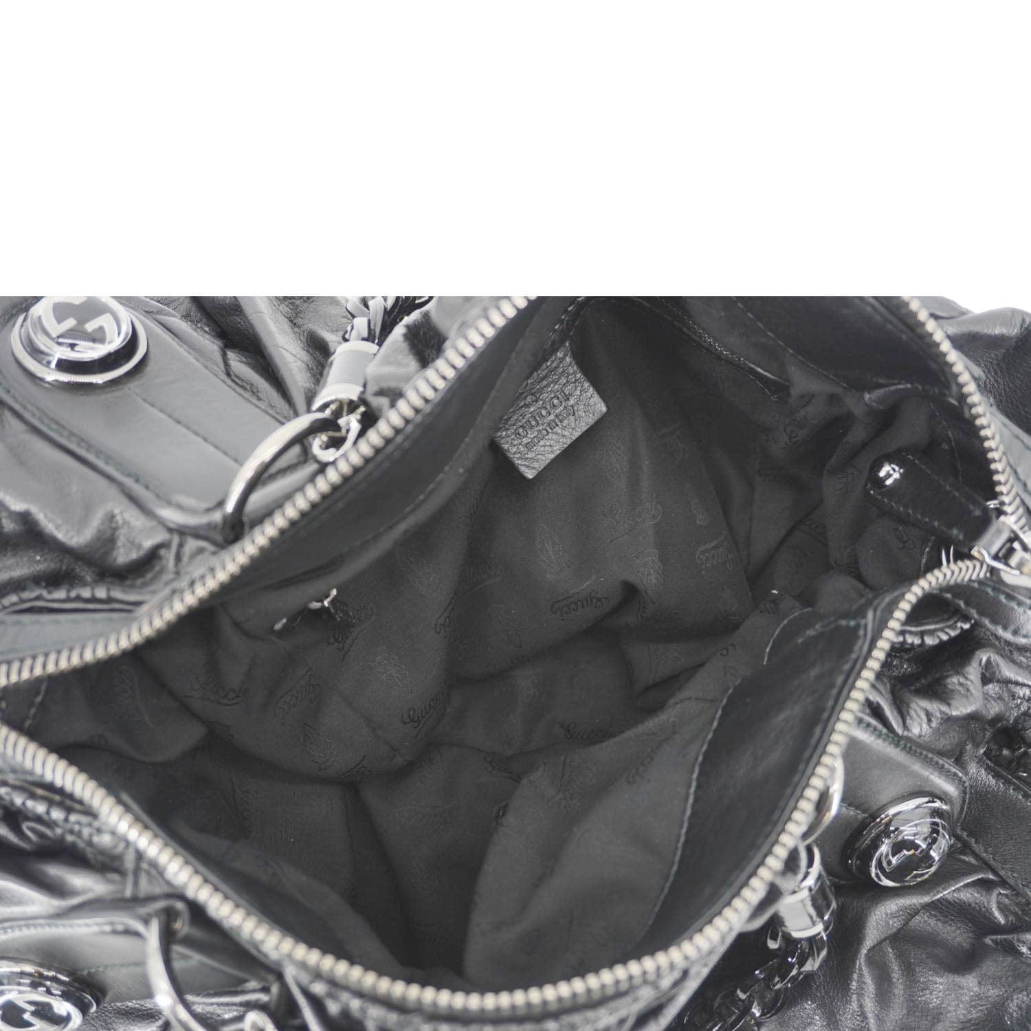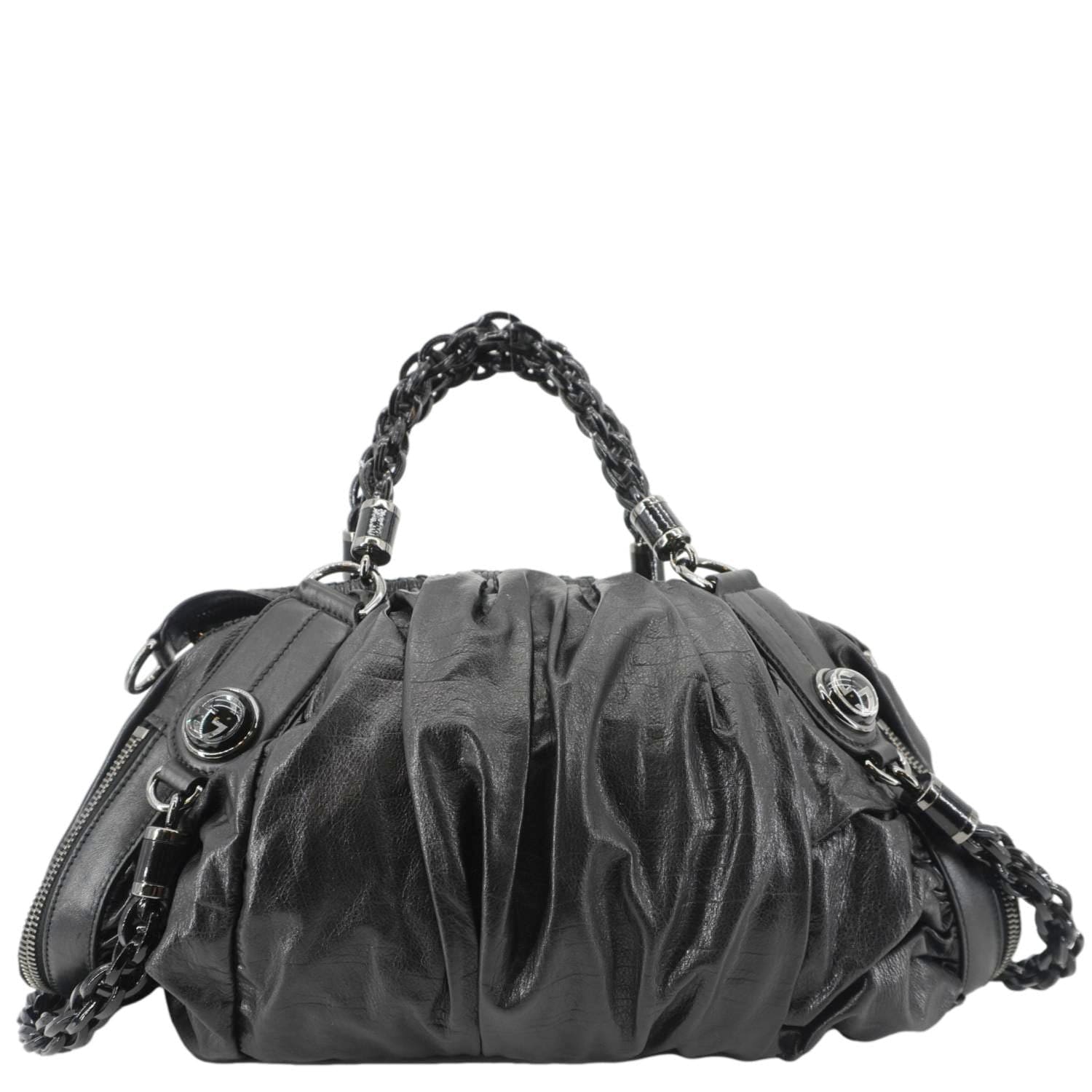 The GUCCI Galaxy Medium is a chic black leather shoulder bag with a top handle, featuring a modern, structured design and the brand's iconic interlocking G detail. Perfect for both day and night, it exudes timeless sophistication.