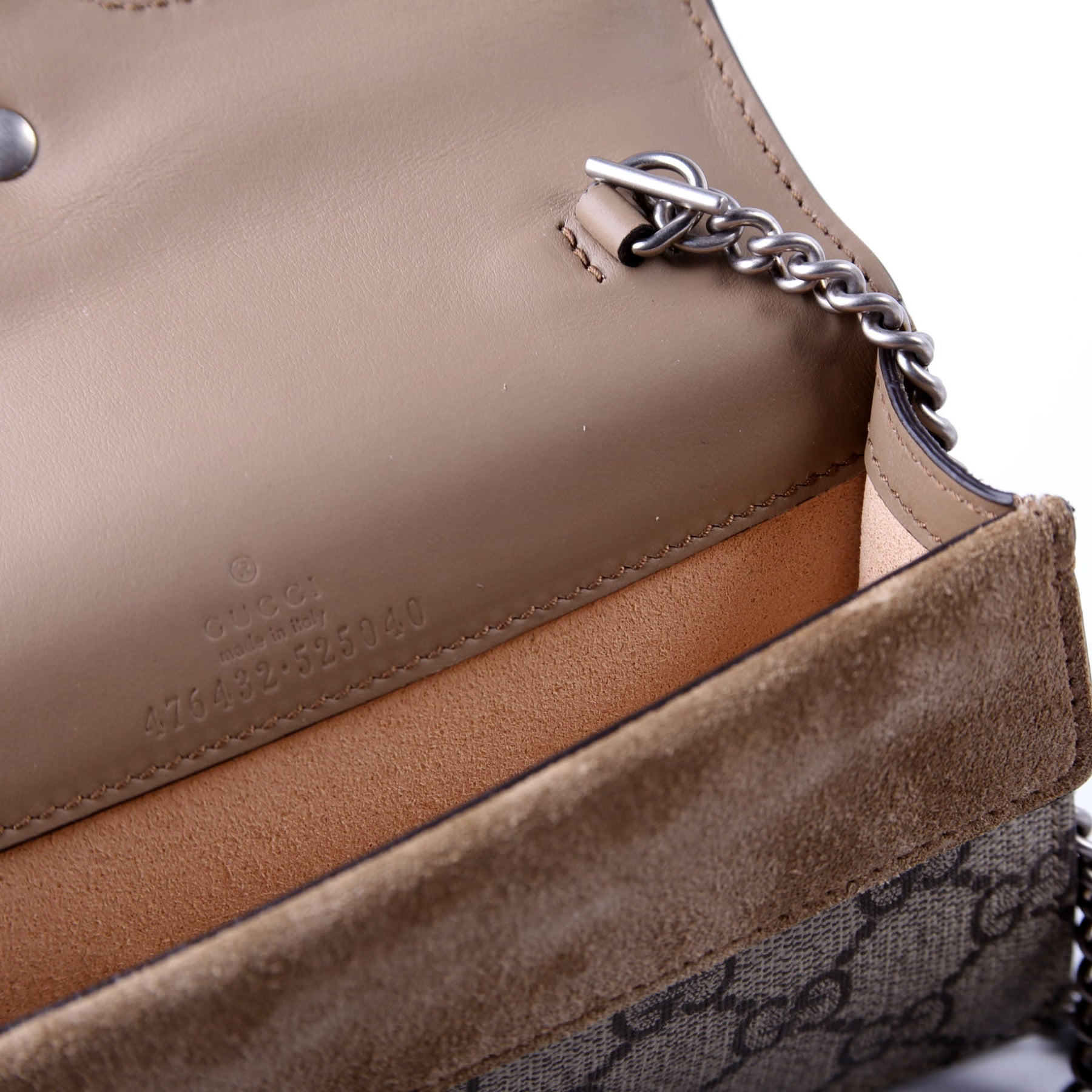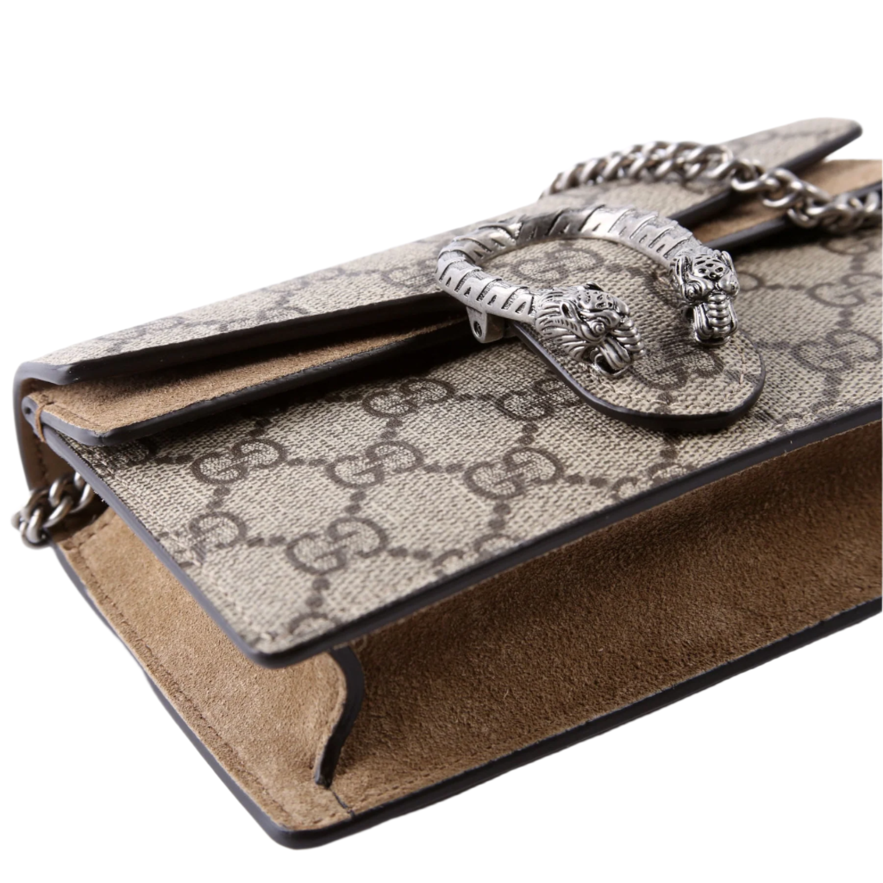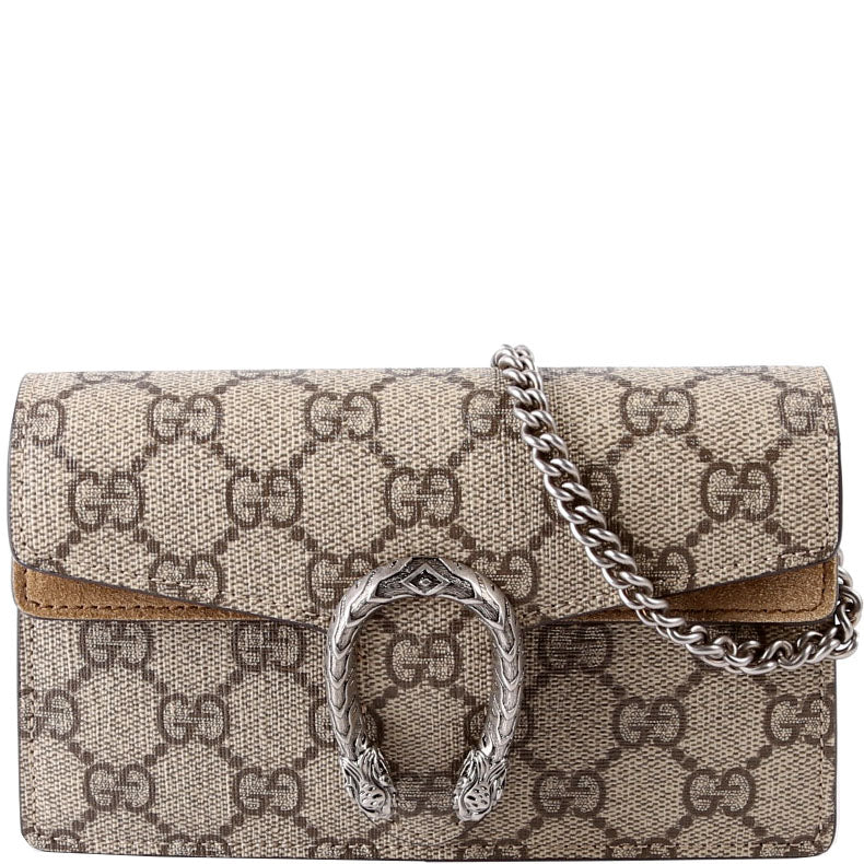 Let our smart tool help you find similar products you might like.The Gucci Dionysus GG Super Mini Crossbody Bag in tan features the brand's iconic GG Supreme canvas with a distinctive tiger head closure. Its compact size and stylish design make it a chic and functional accessory for day-to-night wear.