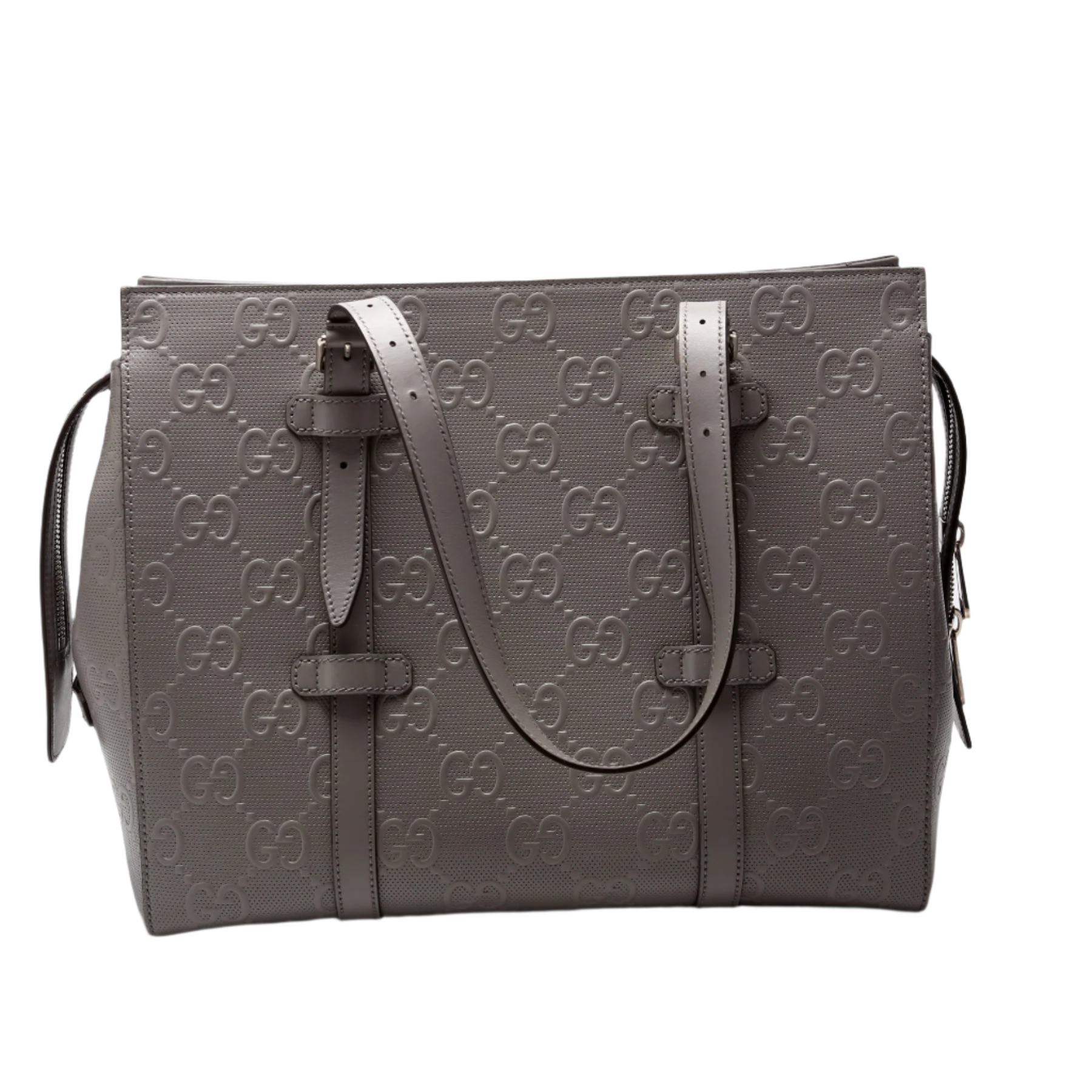 Let our smart tool help you find similar products you might like.The Gucci Embossed Leather Tote Bag in grey features a luxurious embossed leather design, offering a sophisticated and timeless look. Its spacious interior and elegant style make it a versatile accessory for everyday wear.