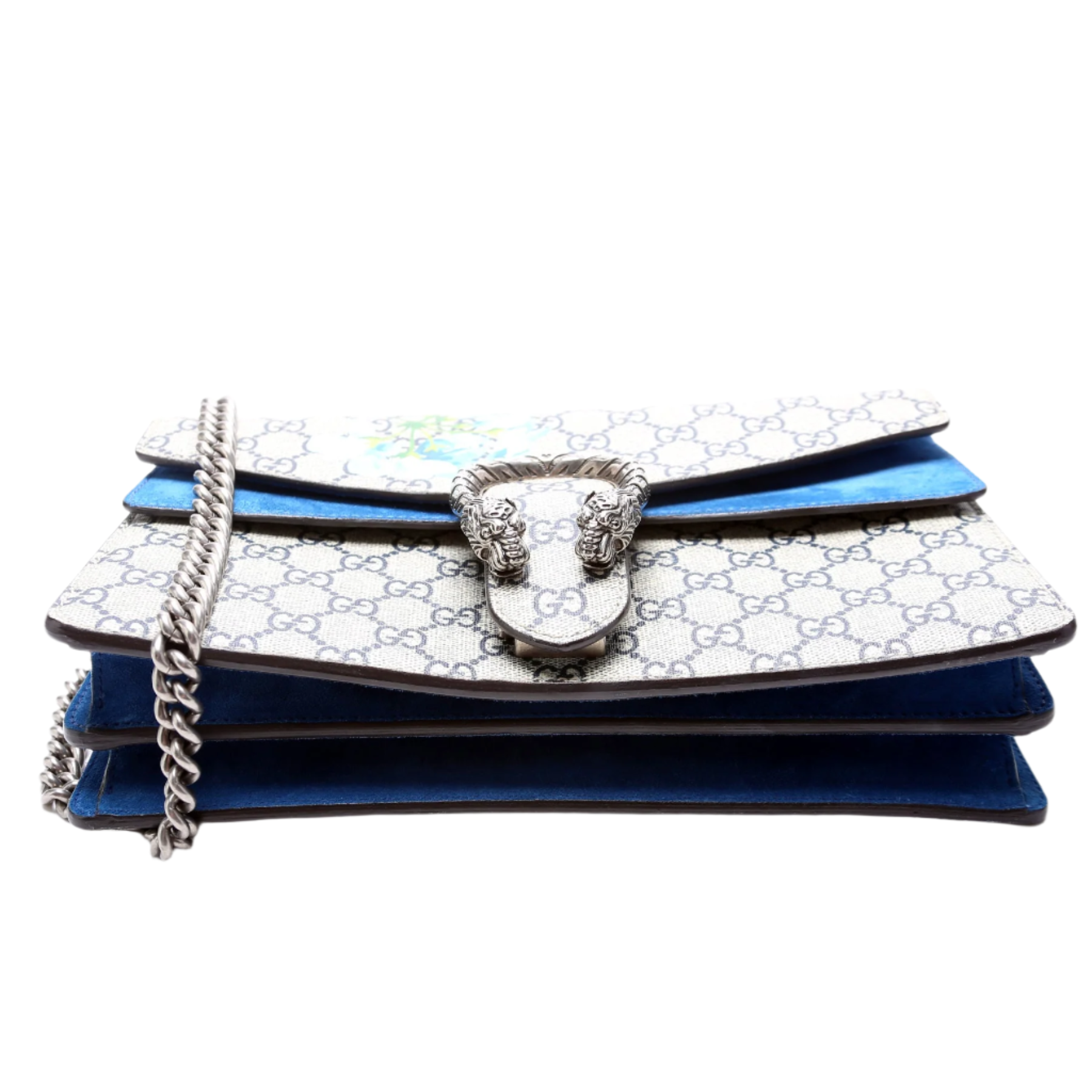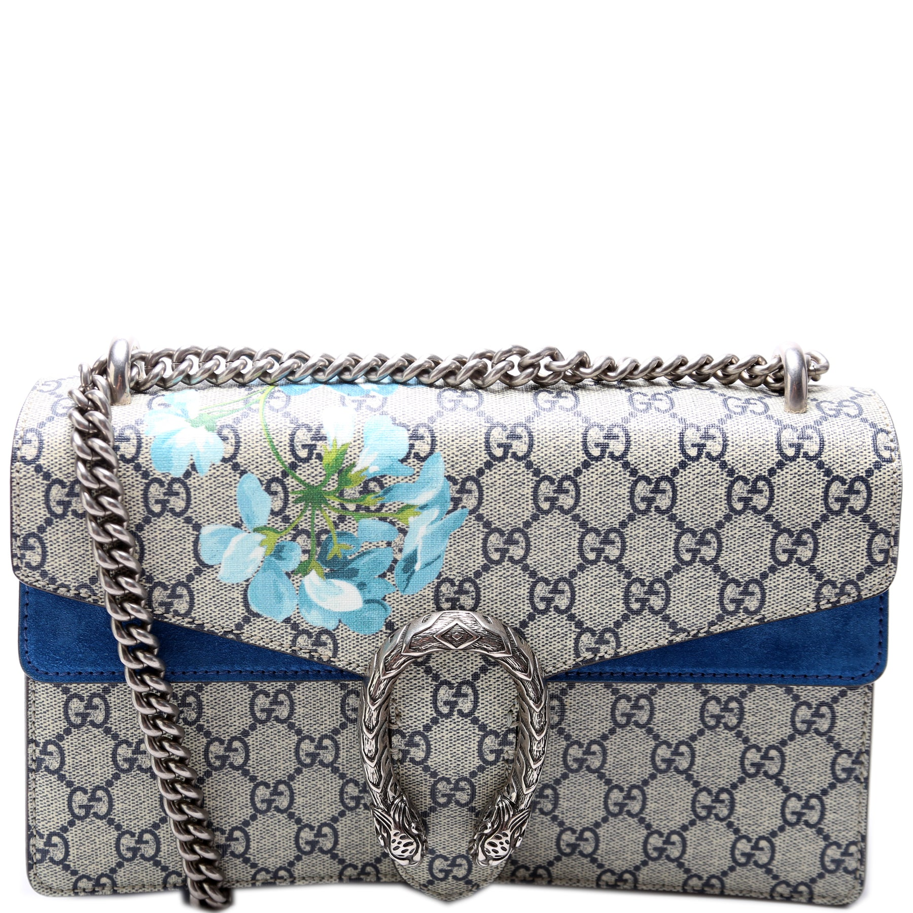 Let our smart tool help you find similar products you might like.This Gucci GG Blooms Dionysus Small Shoulder Bag in blue features a signature floral print and the iconic Dionysus hardware. A luxurious and stylish accessory that effortlessly blends sophistication with bold elegance.