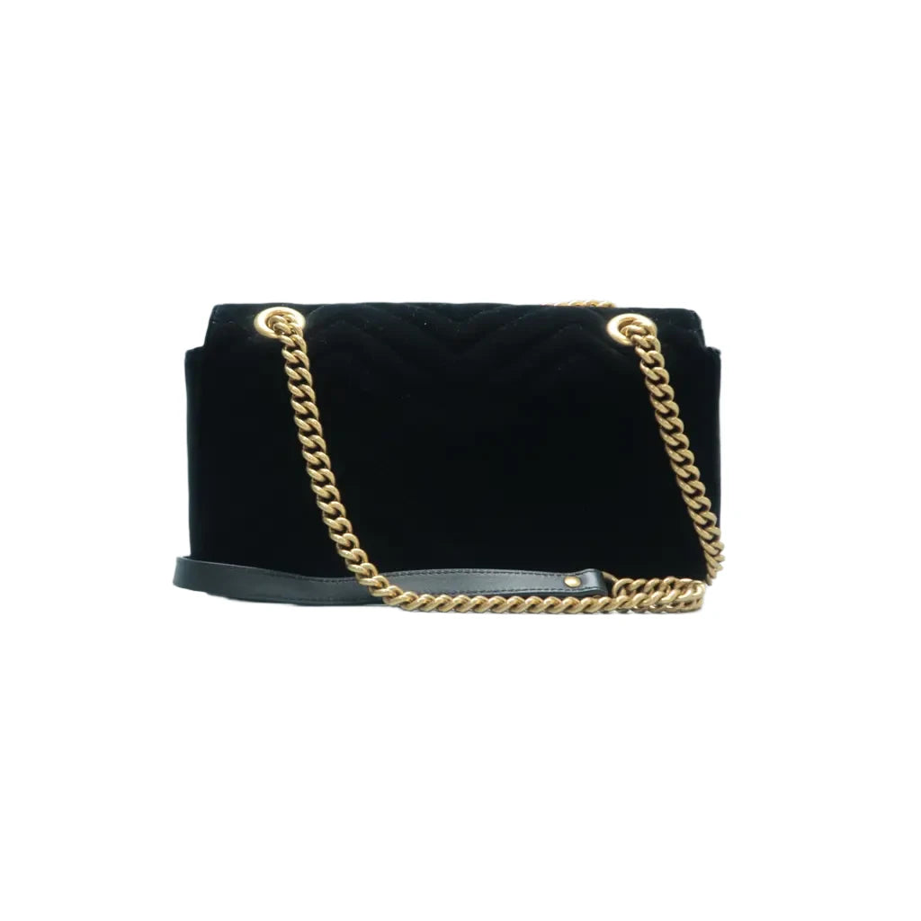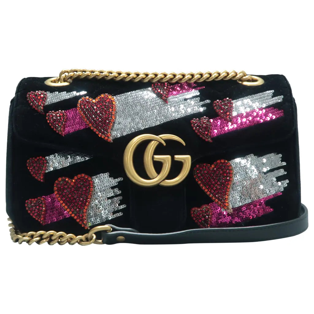 Let our smart tool help you find similar products you might like.The GUCCI GG Marmont Small Matelassé Crystal Sequin Heart Embroidered Velvet Camera Bag in Black is a luxurious, playful piece featuring soft velvet with a matelassé finish and intricate deer embroidery. Accented with the iconic GG logo and an adjustable chain strap, it’s perfect for adding a whimsical touch to evening looks.