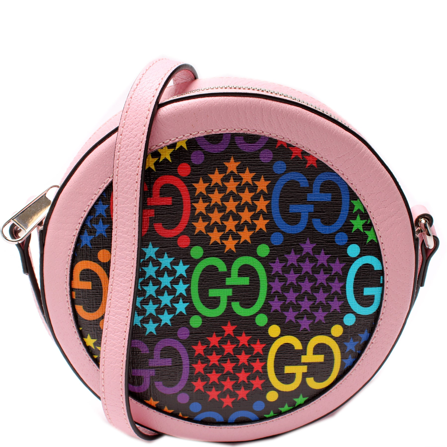 Let our smart tool help you find similar products you might like.The Gucci GG Psychedelic Round Leather Crossbody Bag in multicolor features bold, vibrant patterns with the iconic GG logo for a fun and fashionable look. Its circular design and adjustable strap offer a unique and stylish accessory for any occasion.
