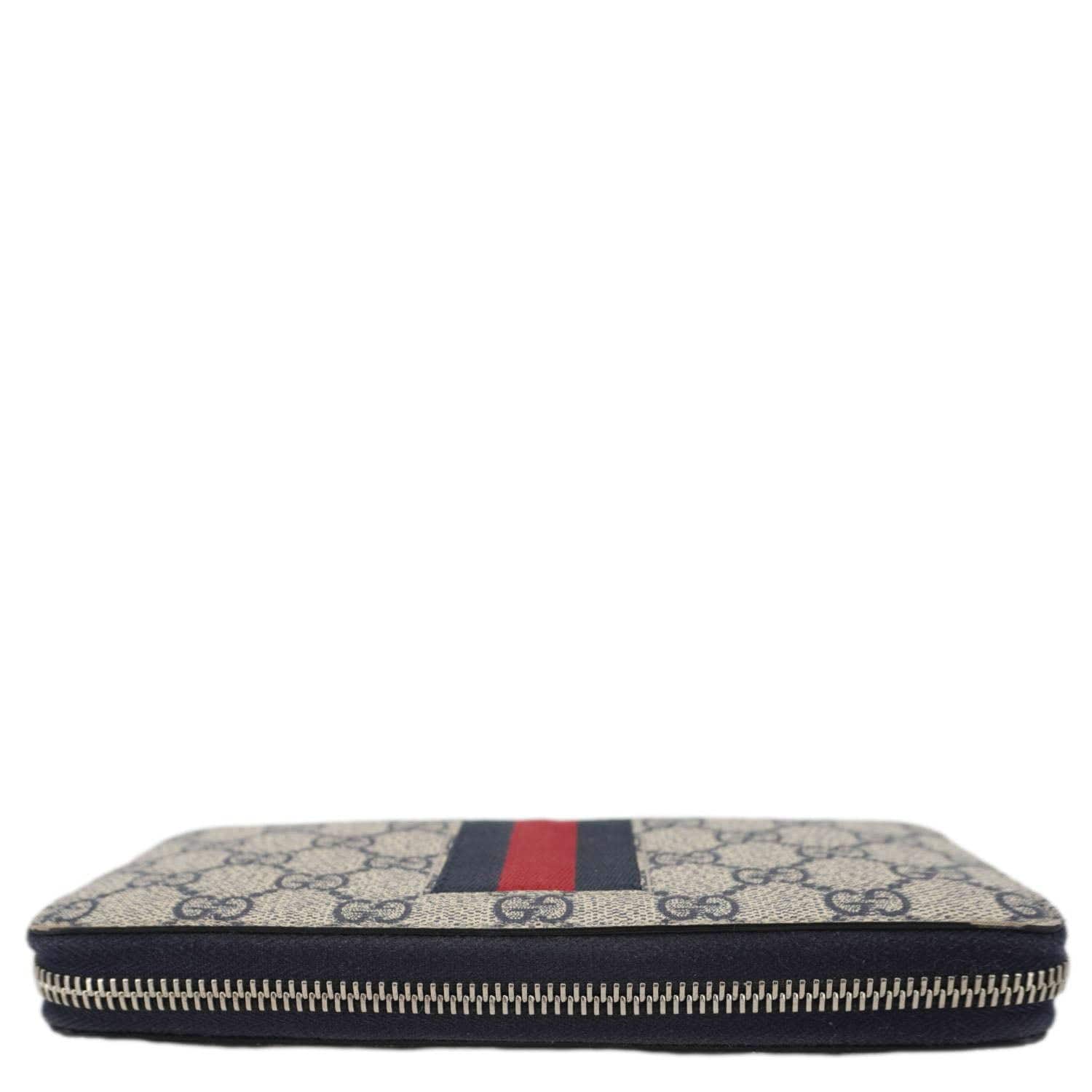 Gucci GG Supreme canvas zip-around wallet in white. A sleek and spacious design with multiple card slots, a zippered coin pocket, and refined everyday luxury.