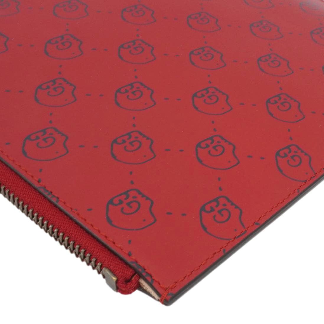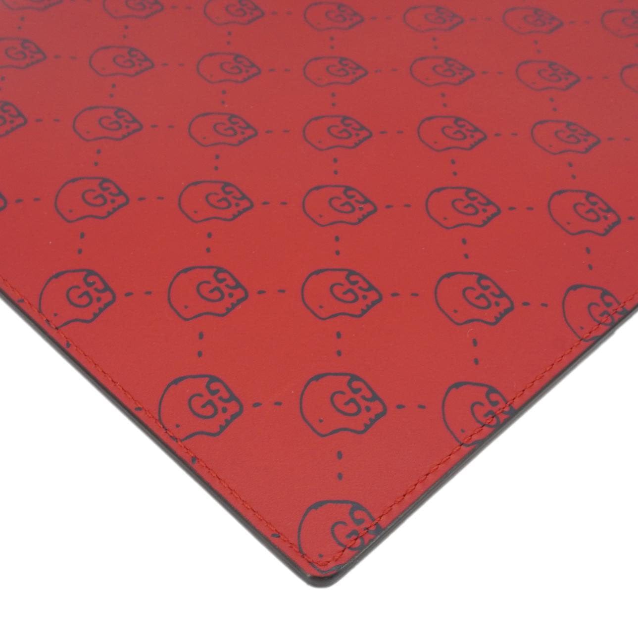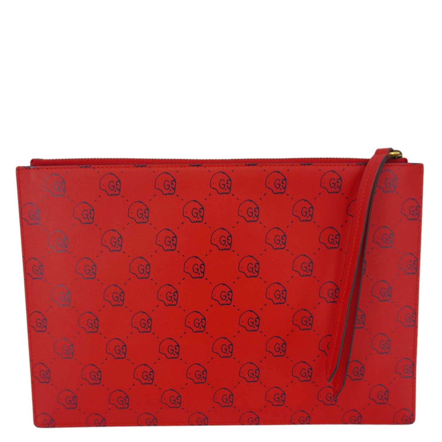 The Gucci Ghost Hamlet Skull Zip Pouch in Hibiscus Red Calfskin Leather features a bold skull graphic with a street-art-inspired design. Stylish and edgy, it’s perfect for carrying essentials with a statement look.