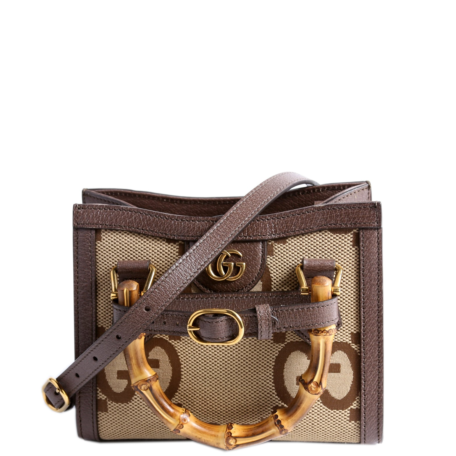 Let our smart tool help you find similar products you might like.The Gucci Jumbo GG Canvas Diana Mini Tote Bag in brown features the iconic GG monogram with a stylish, compact design. Its elegant canvas exterior and functional structure make it a versatile addition to any collection.