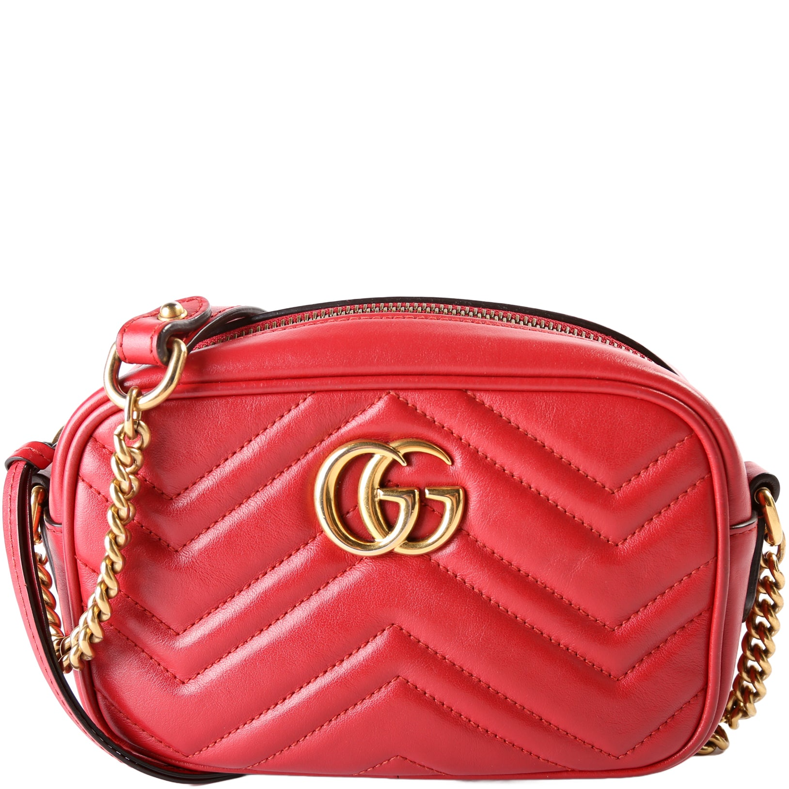 Let our smart tool help you find similar products you might like.The Gucci Marmont Leather Mini Camera Bag in red features smooth leather with the signature GG logo, offering a stylish and versatile accessory. Its compact size and chain strap make it perfect for both day and evening wear, adding a pop of color to any outfit.