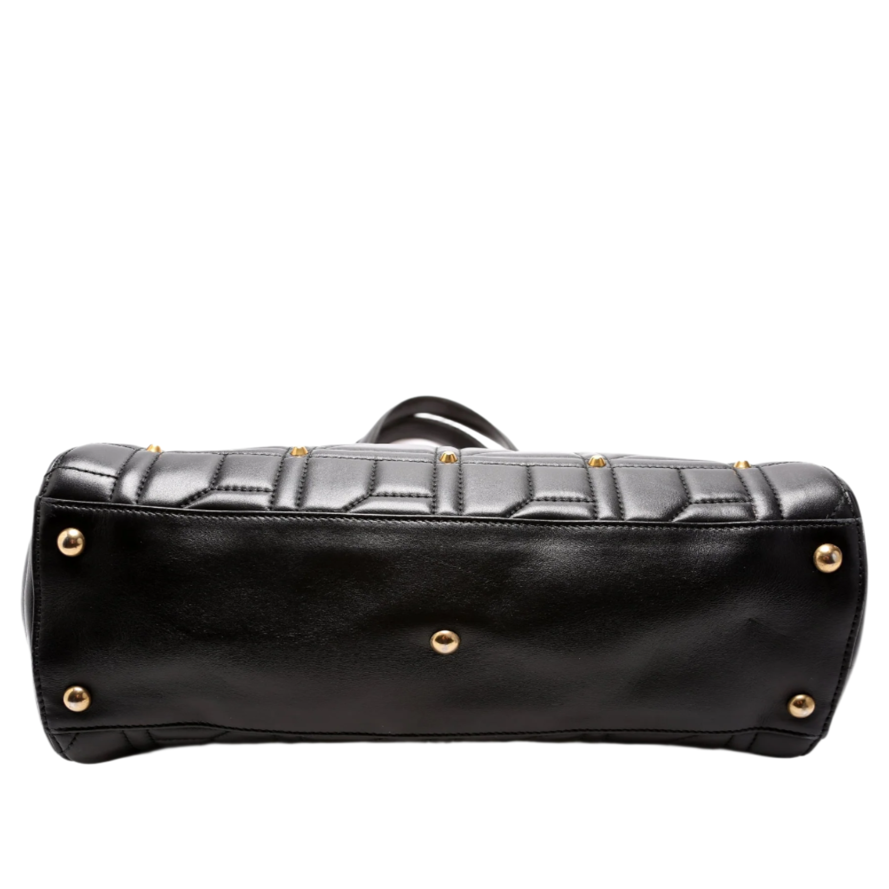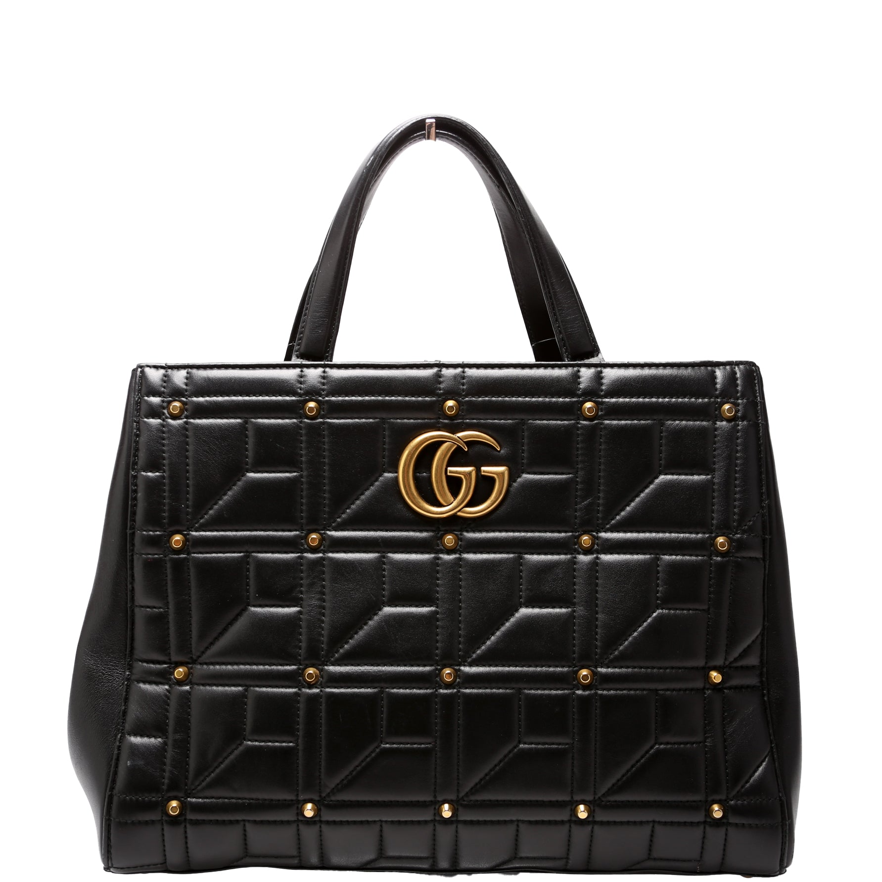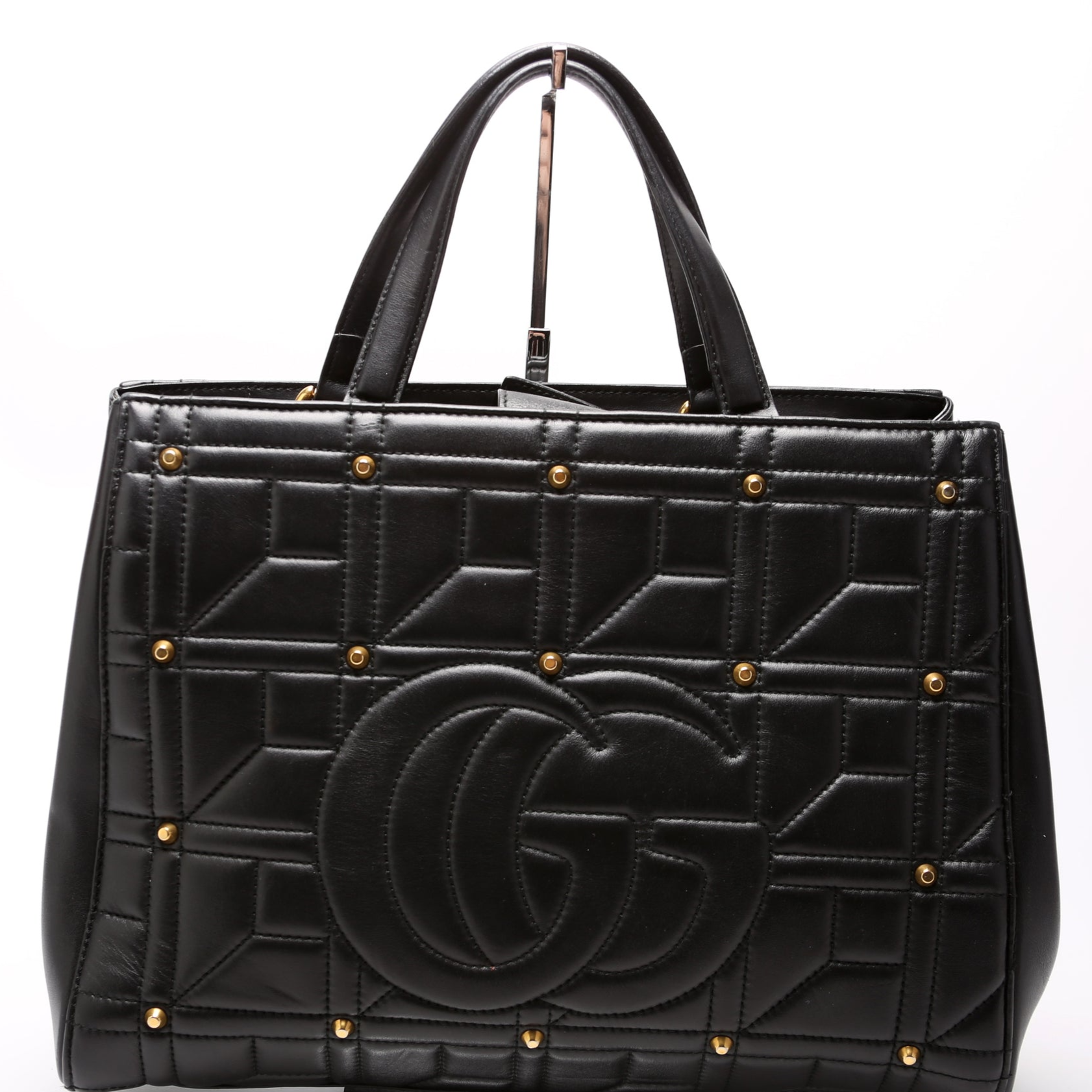 Let our smart tool help you find similar products you might like.The Gucci Marmont Leather Studded Top Handle Bag in black combines edgy studded detailing with the brand's signature elegance. Its structured design and luxurious leather make it a standout accessory for any occasion.