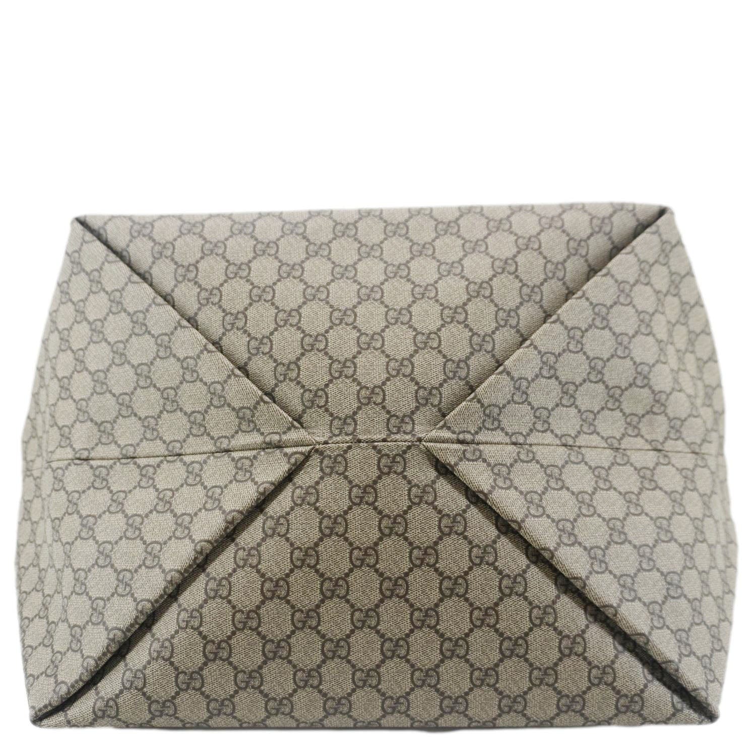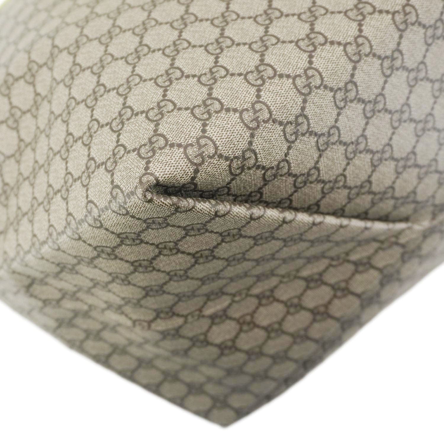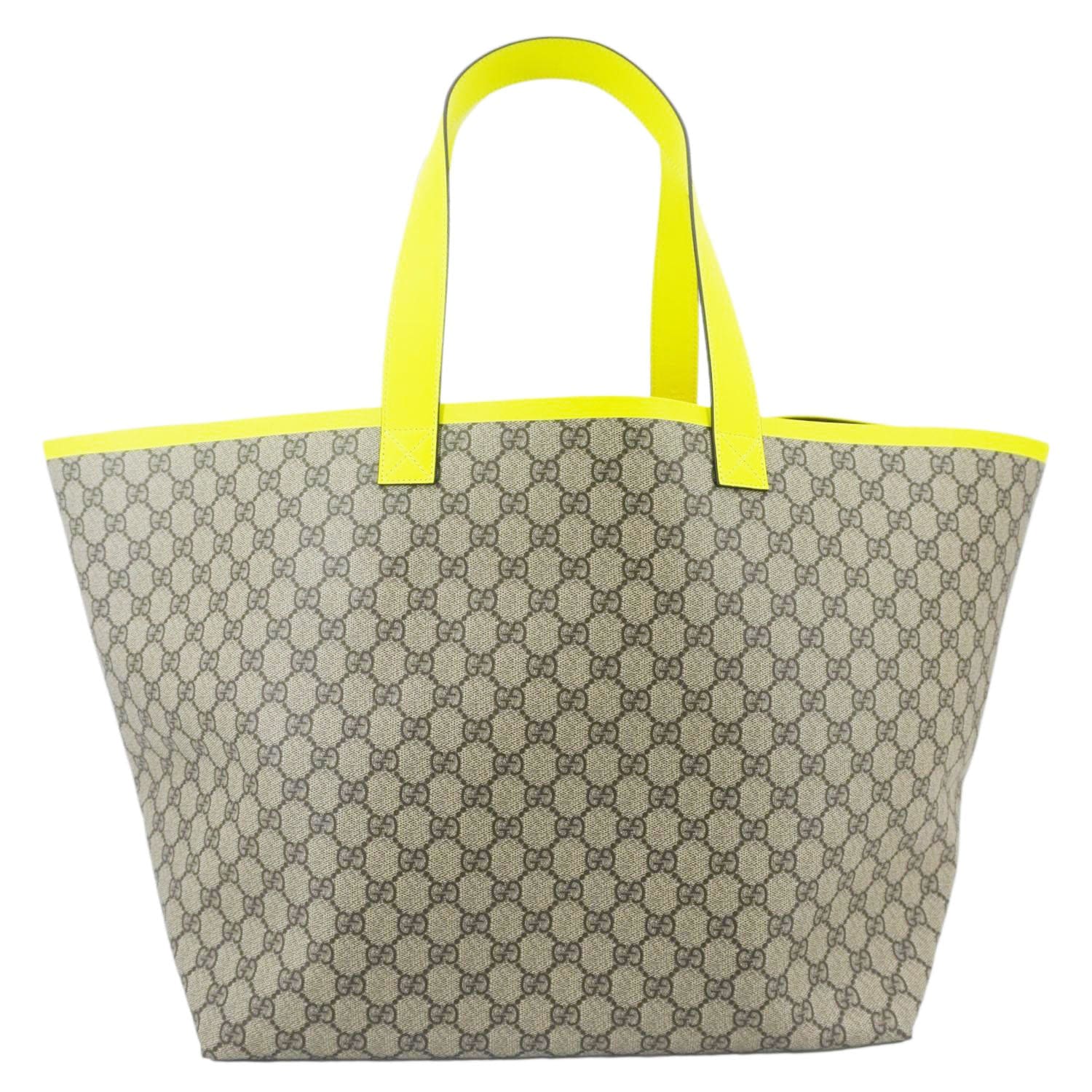 The Gucci Ophidia Medium Tote features classic GG Supreme canvas with bold neon yellow leather trim and matching detachable pouch. This eye-catching bag combines spacious functionality with a vibrant modern twist.