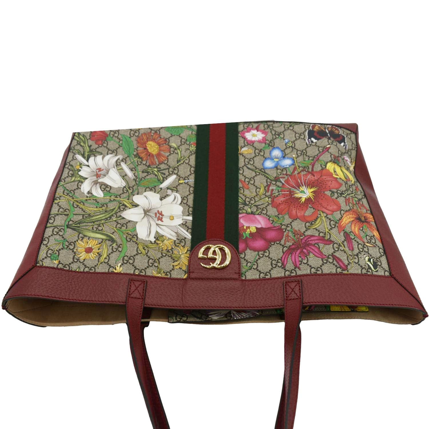 The GUCCI Ophidia Medium Floral GG Supreme Tote blends the classic GG canvas with vibrant floral prints and signature web stripes. Spacious and stylish, it’s a perfect statement piece.