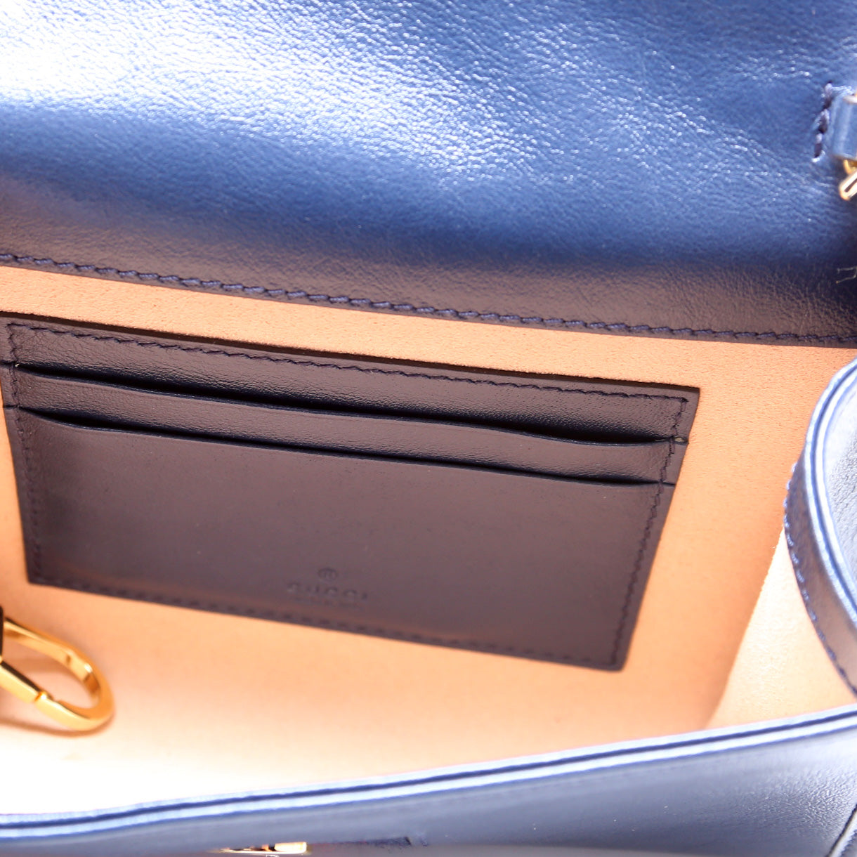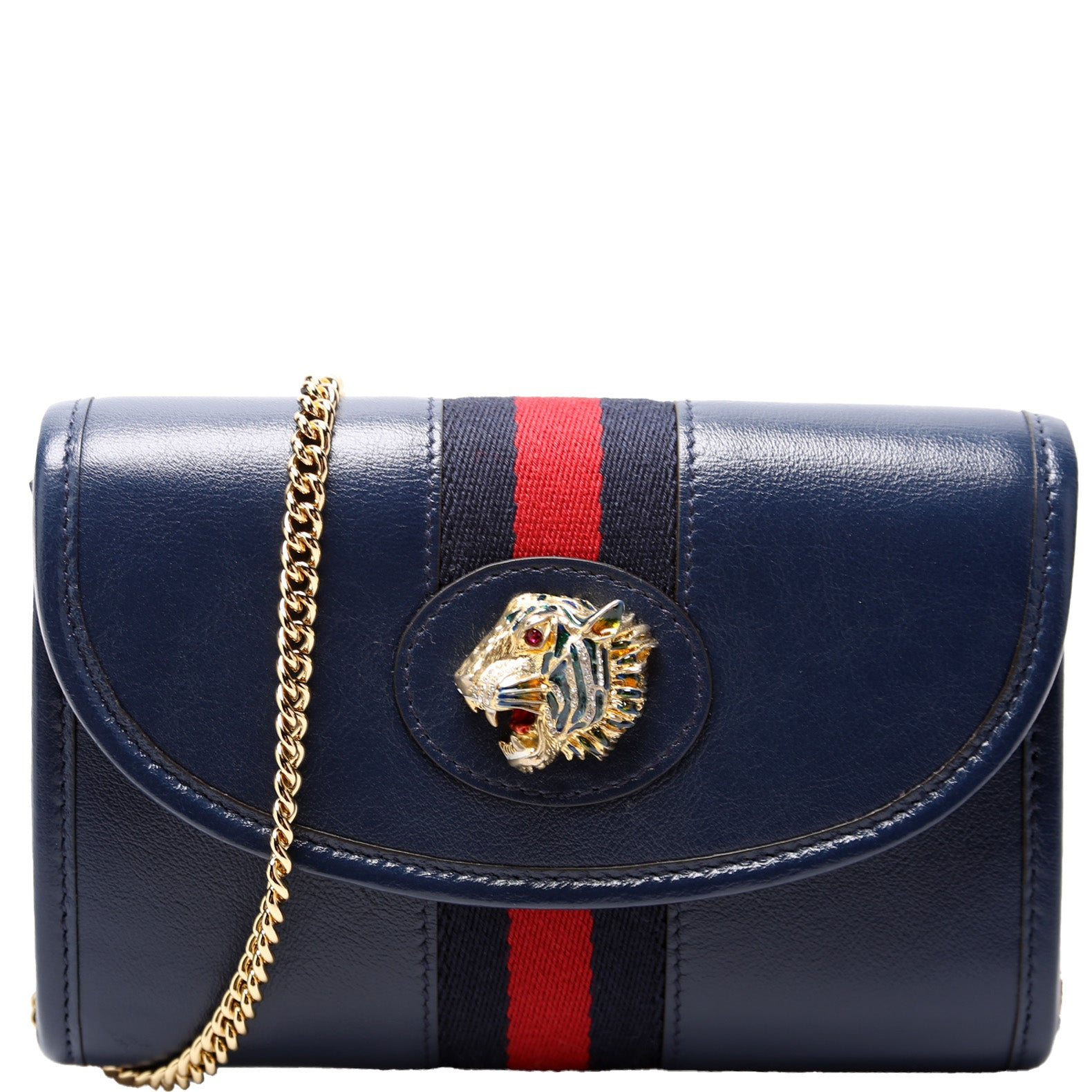 Let our smart tool help you find similar products you might like.This Gucci Rajah Web mini bag is crafted from premium leather in navy, featuring the signature Web stripe and a bold tiger head clasp. Its compact size and luxurious design make it a stylish and versatile accessory for any occasion.