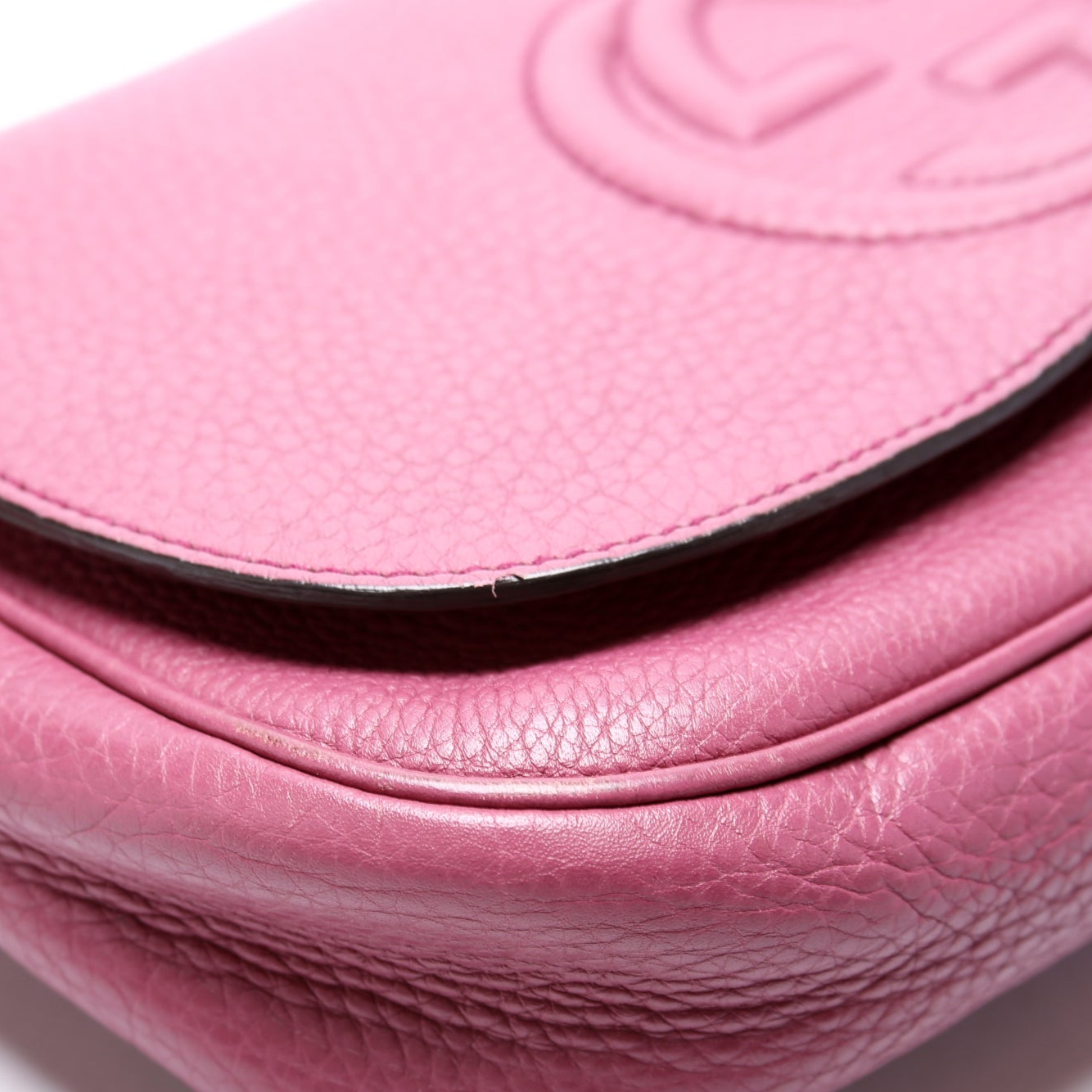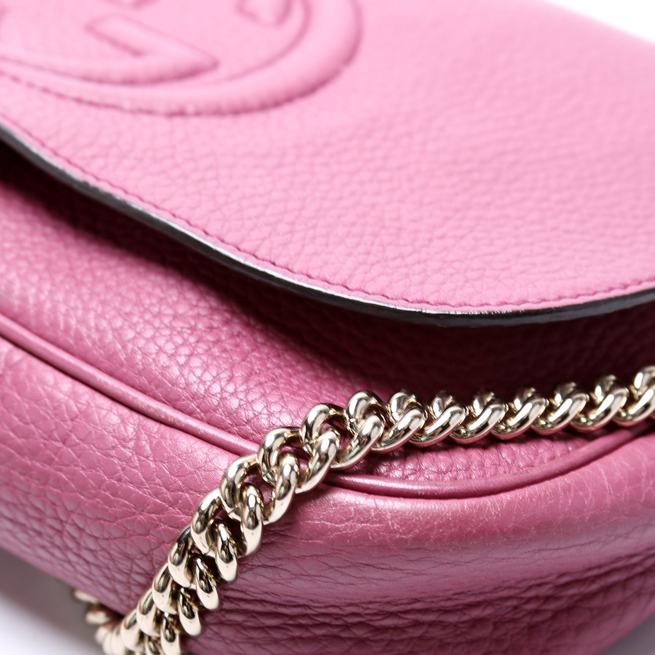 Let our smart tool help you find similar products you might like.The Gucci Soho Chain Leather Crossbody Medium Bag in purple features smooth leather with the iconic embossed GG logo for a chic, standout look. Its versatile design and chain strap make it a stylish and practical accessory for day-to-night wear.