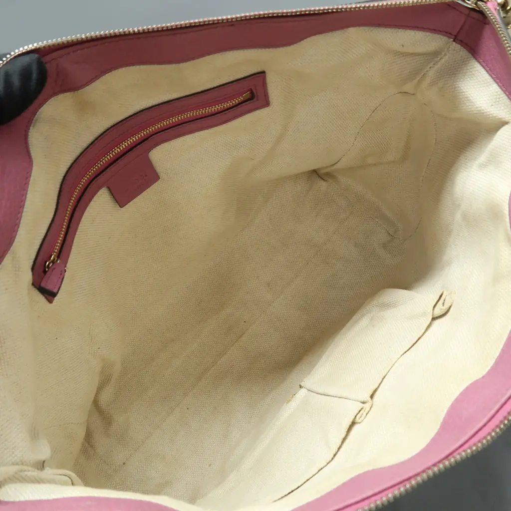 Let our smart tool help you find similar products you might like.The Gucci Soho Leather Tote Bag in purple offers a chic and spacious design with the brand's signature embossed logo. Crafted from luxurious leather, this versatile tote is perfect for adding a pop of color to your everyday style.