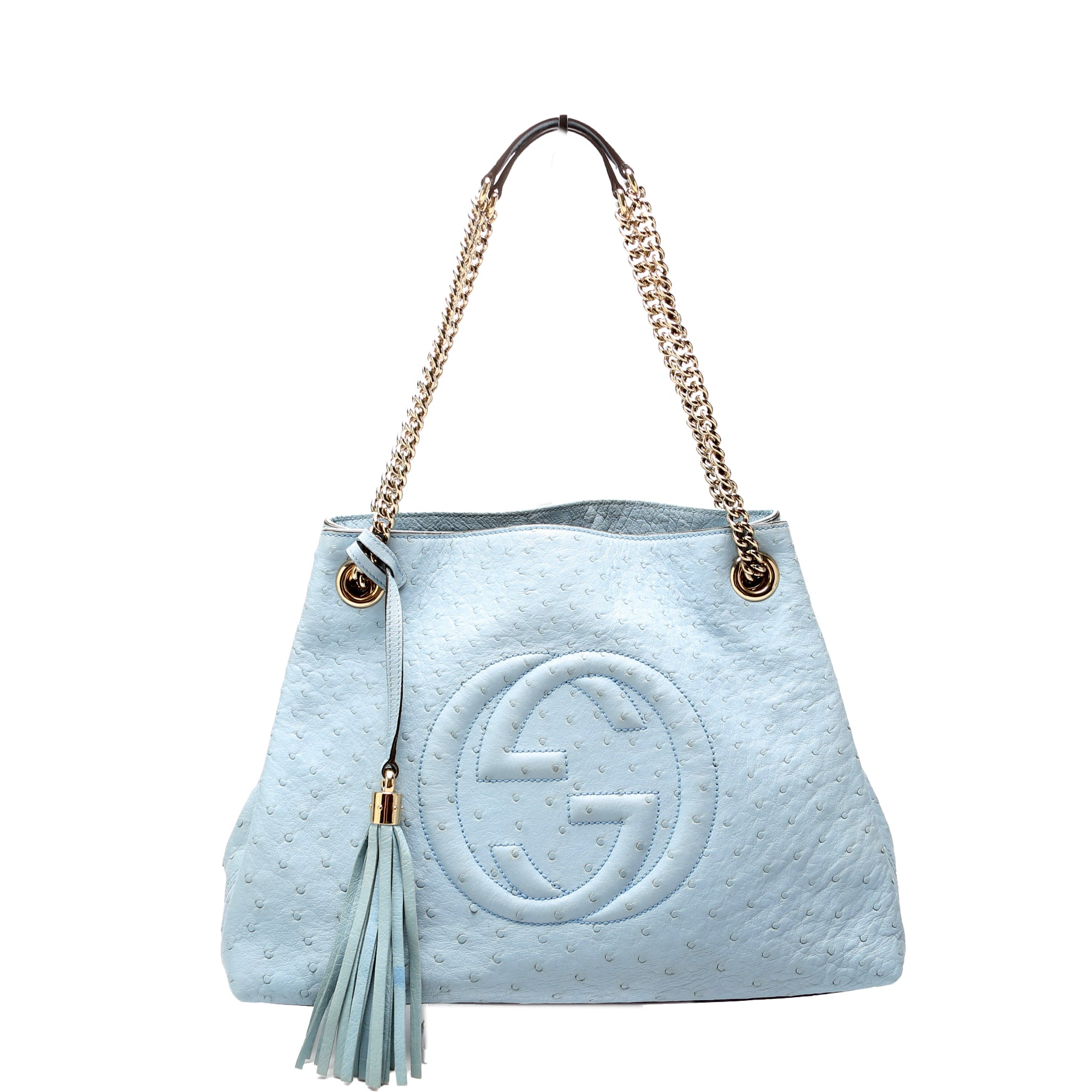 Let our smart tool help you find similar products you might like.The Gucci Soho Ostrich Leather Shoulder Bag in blue features luxurious ostrich leather with the iconic GG logo for a sophisticated and elegant design. A timeless, versatile piece perfect for elevating your everyday style with a touch of luxury.