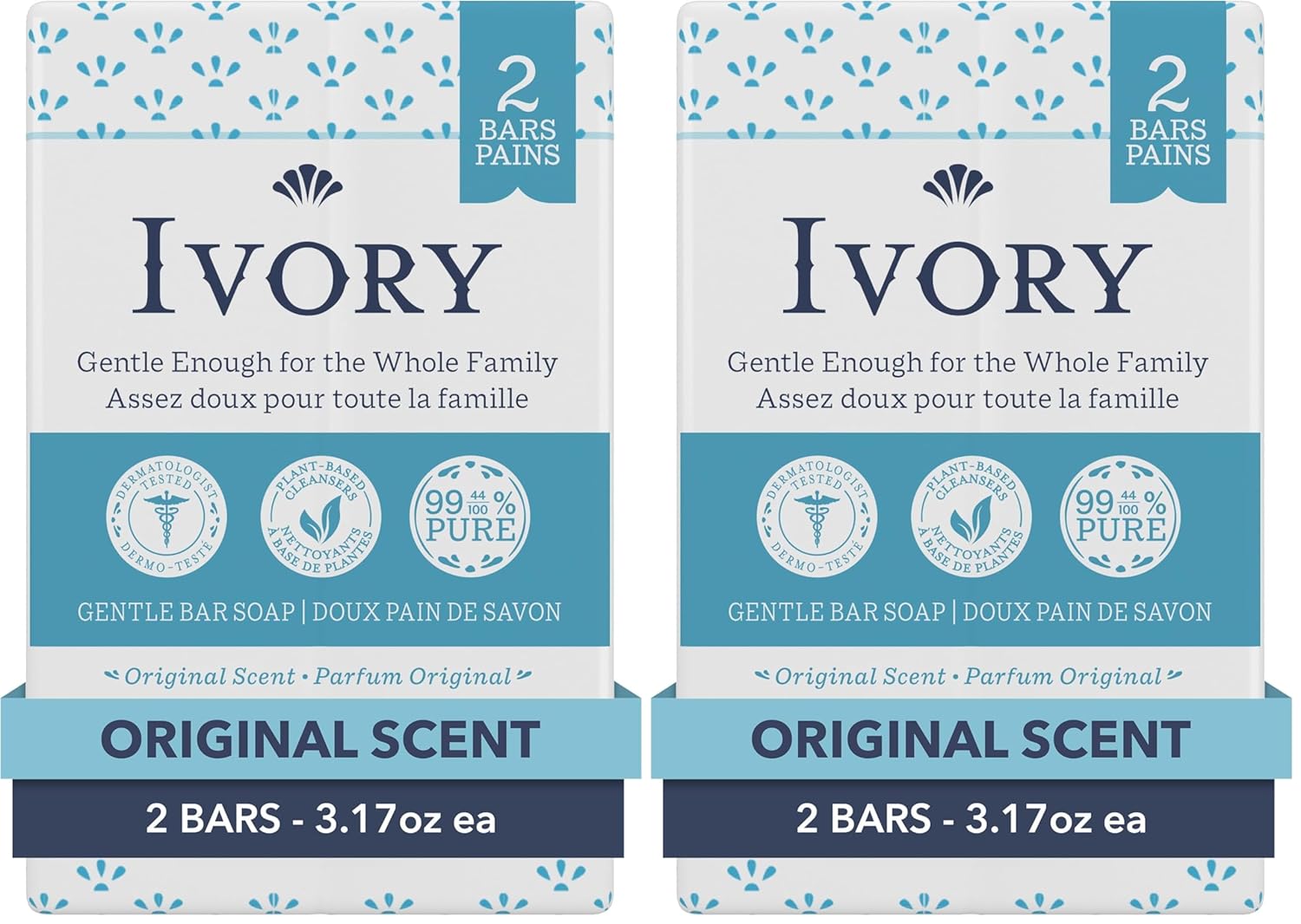 Ivory Gentle Bath Bar Soap, Designed for Whole Family, 99.44% Pure Formula with Plant-Based Cleansers, Made Without Heavy Perfumes, Parabens or Phthalates, Original Scent, 4.0 oz (4 Count)